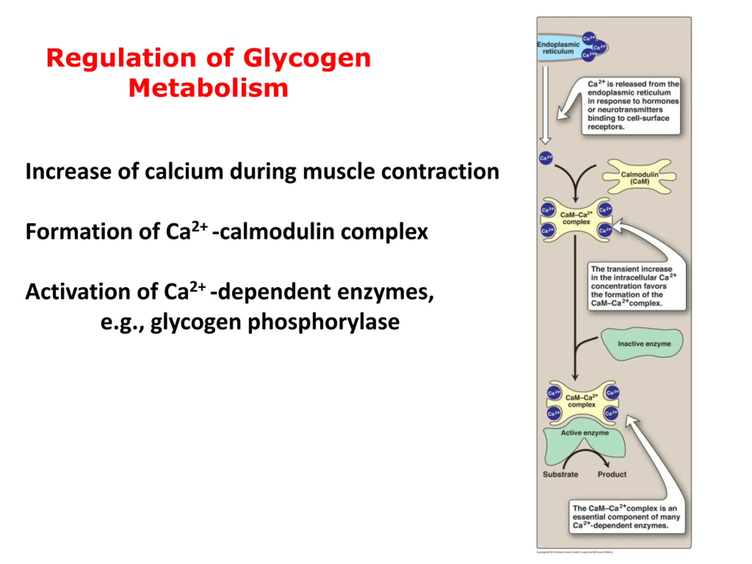 Regulation ofGlycogen Metabolism Increase of calcium during muscle contraction Formation of Ca2+ -calmodulin complex Activation of Ca2+ -dependent enzymes, e.g., glycogen phosphorylase