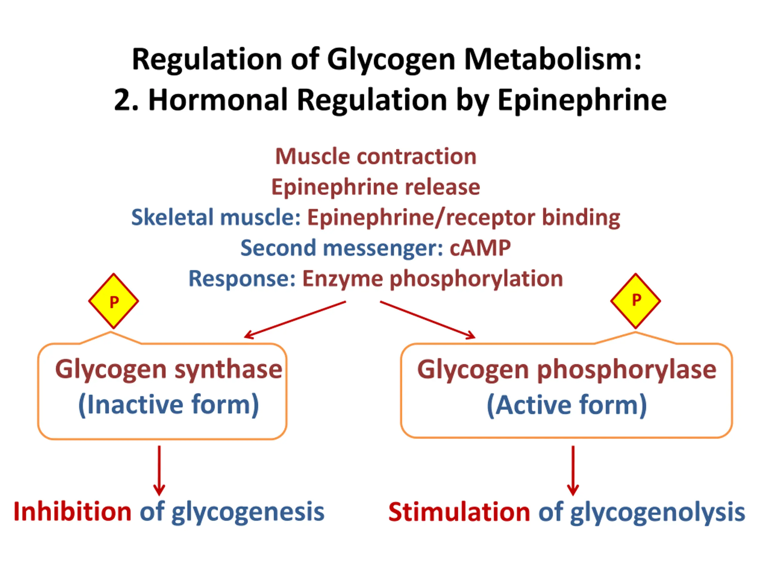 Regulation of Glycogen Metabolism: 2. Hormonal Regulation by Epinephrine Muscle contraction Epinephrine release Skeletal muscle: Epinephrine/receptor binding Second messenger: cAMP Response: Enzyme phosphorylation P P Glycogen synthase (Inactive form) Glycogen phosphorylase (Active form) Inhibition of glycogenesis Stimulation of glycogenolysis