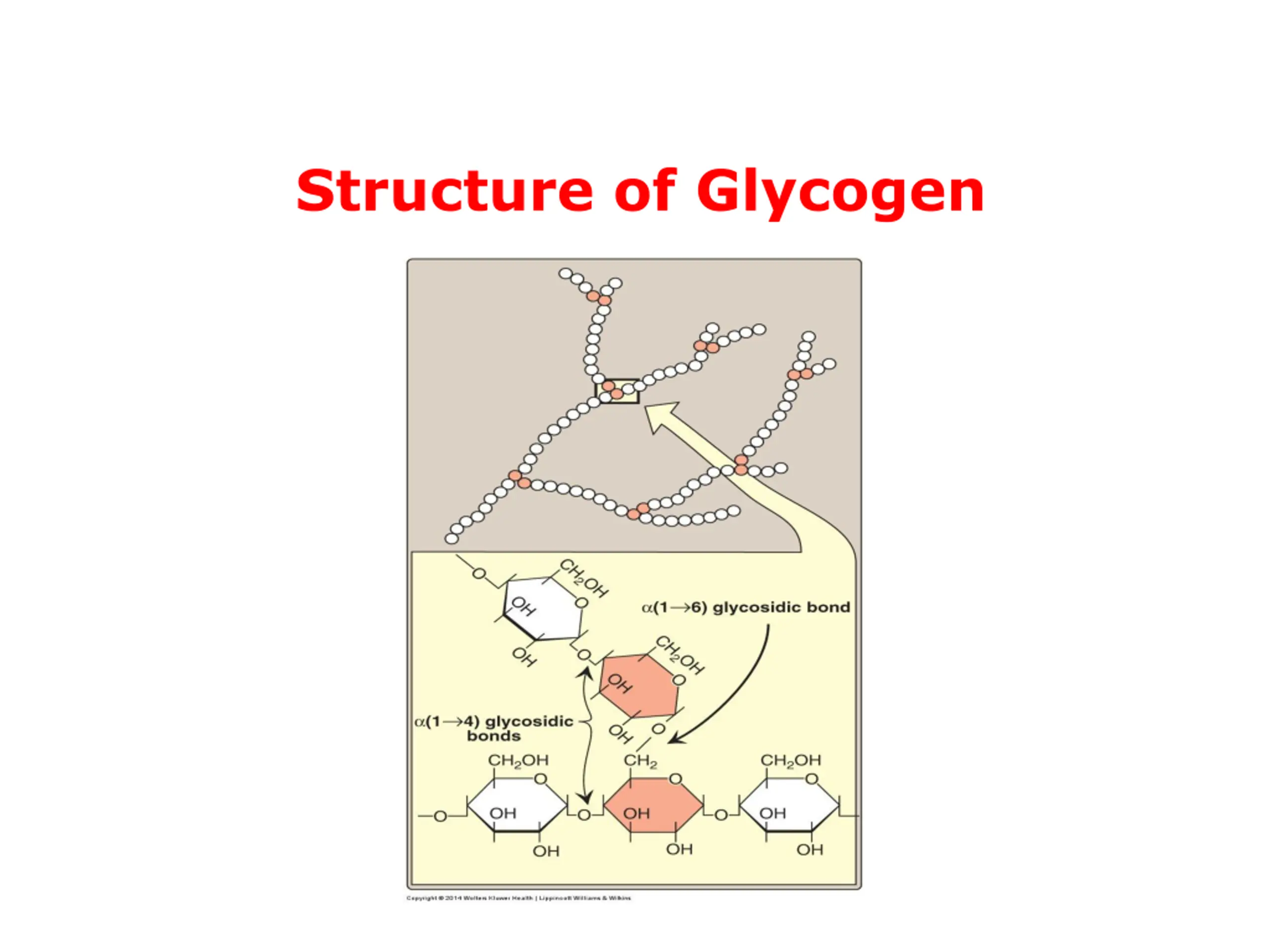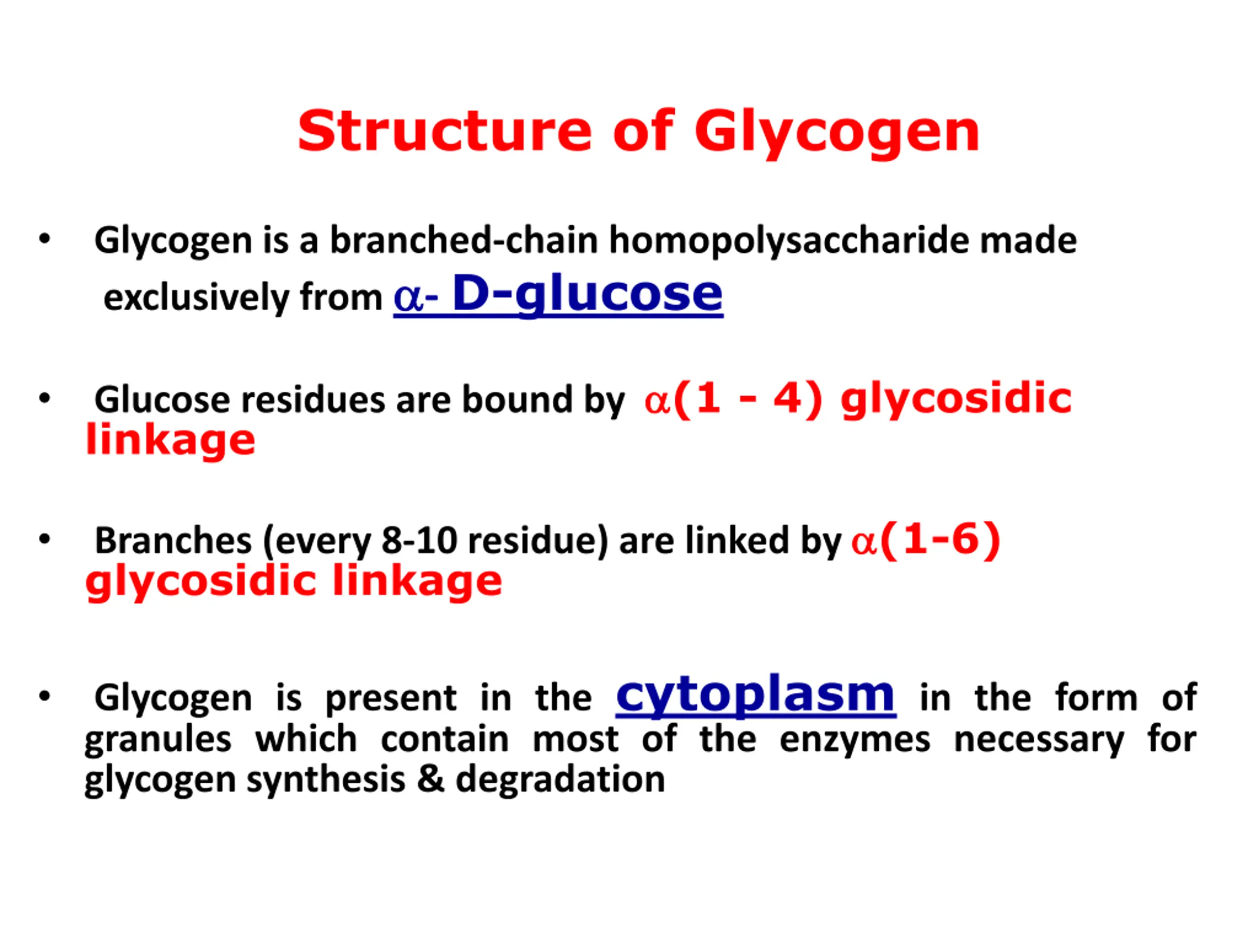 Structure of Glycogen Glycogen is a branched-chain homopolysaccharide made exclusively from - D-glucose Glucose residues are bound by (1 - 4) glycosidic linkage Branches (every 8-10 residue) are linked by (1-6) glycosidic linkage Glycogen is present in the cytoplasm in the form of granules which contain most of the enzymes necessary for glycogen synthesis & degradation