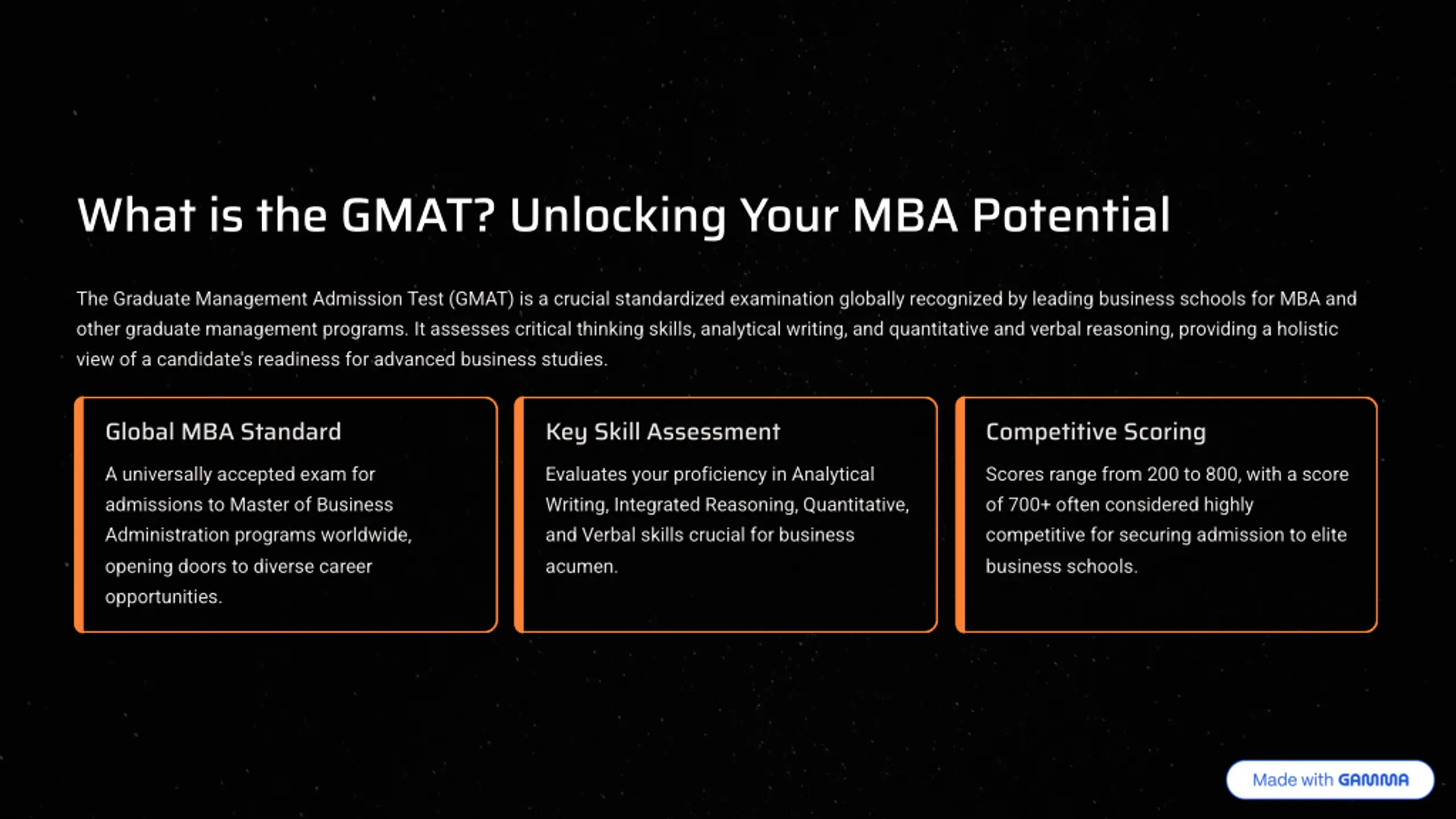 What is the GMAT? Unlocking Your MBA Potential The Graduate Management Admission Test (GMAT) is a crucial standardized examination globally recognized by leading business schools for MBA and other graduate management programs. It assesses critical thinking skills, analytical writing, and quantitative and verbal reasoning, providing a holistic view of a candidate's readiness for advanced business studies. Global MBA Standard Key Skill Assessment Competitive Scoring A universally accepted exam for admissions to Master of Business Administration programs worldwide, opening doors to diverse career opportunities. Evaluates your proficiency in Analytical Writing, Integrated Reasoning, Quantitative, and Verbal skills crucial for business acumen. Scores range from 200 to 800, with a score of 700+ often considered highly competitive for securing admission to elite business schools.