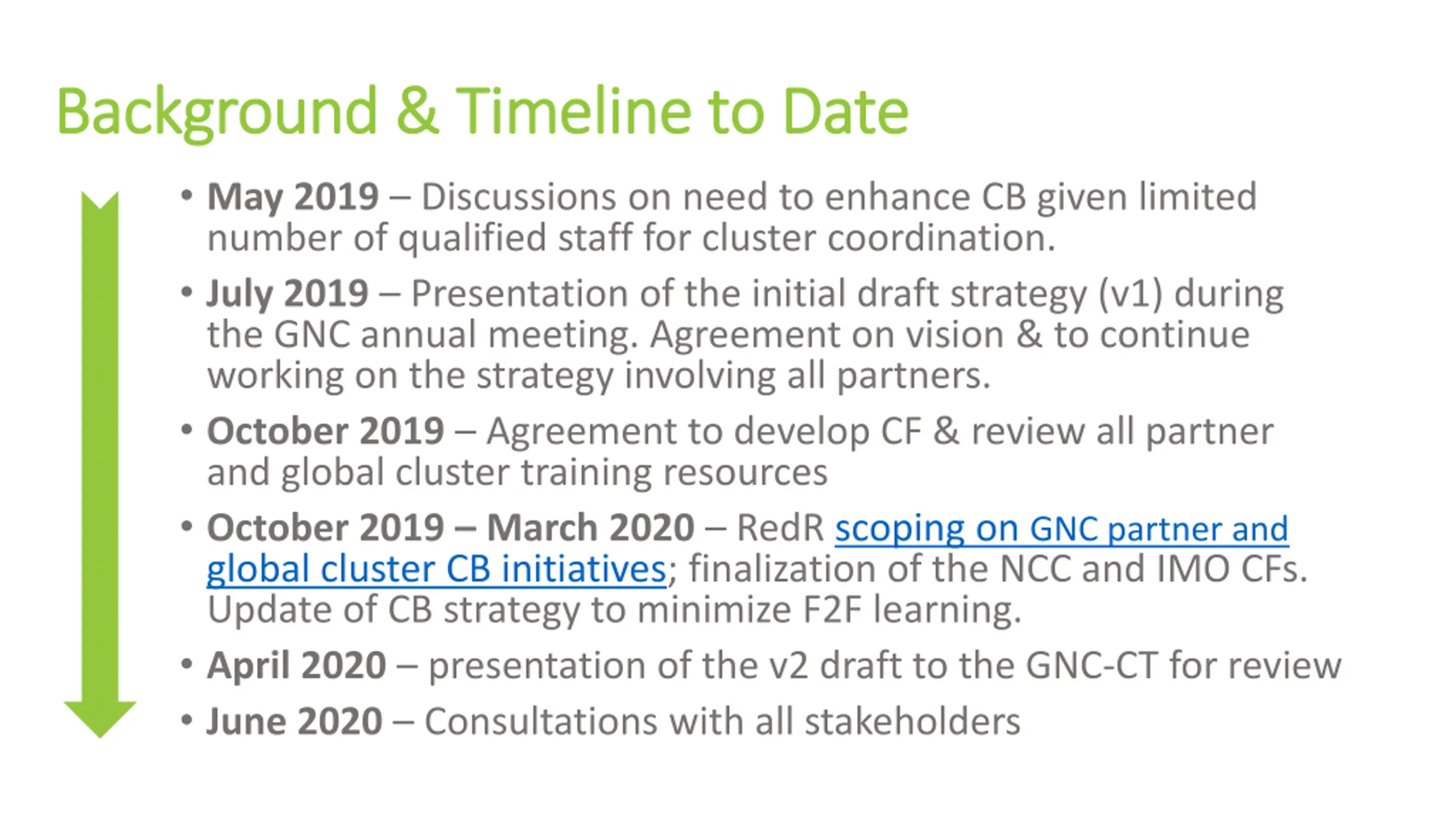 Background & Timeline to Date Background & Timeline to Date May 2019 Discussions on need to enhance CB given limited number of qualified staff for cluster coordination. July 2019 Presentation of the initial draft strategy (v1) during the GNC annual meeting. Agreement on vision & to continue working on the strategy involving all partners. October 2019 Agreement to develop CF & review all partner and global cluster training resources October 2019 March 2020 RedR scoping on GNC partner and global cluster CB initiatives; finalization of the NCC and IMO CFs. Update of CB strategy to minimize F2F learning. April 2020 presentation of the v2 draft to the GNC-CT for review June 2020 Consultations with all stakeholders