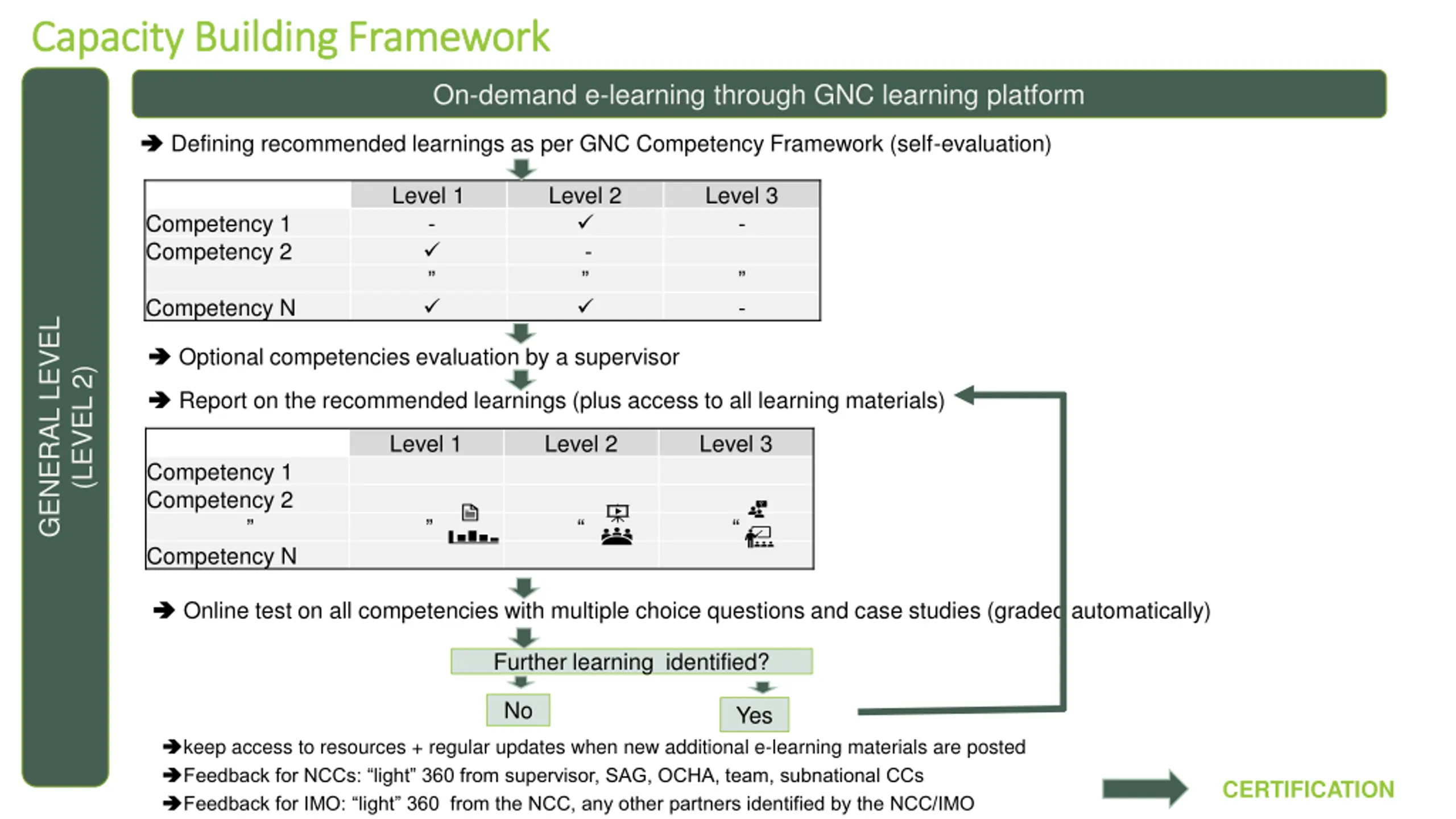 Capacity Building Framework Capacity Building Framework On-demand e-learning through GNC learning platform Defining recommended learnings as per GNC Competency Framework (self-evaluation) Level 1 - Level 2 - Level 3 - Competency 1 Competency 2 - Competency N GENERAL LEVEL Optional competencies evaluation by a supervisor (LEVEL 2) Report on the recommended learnings (plus access to all learning materials) Level 1 Level 2 Level 3 Competency 1 Competency 2 Competency N Online test on all competencies with multiple choice questions and case studies (graded automatically) Further learning identified? No Yes keep access to resources + regular updates when new additional e-learning materials are posted Feedback for NCCs: light 360 from supervisor, SAG, OCHA, team, subnational CCs Feedback for IMO: light 360 from the NCC, any other partners identified by the NCC/IMO CERTIFICATION