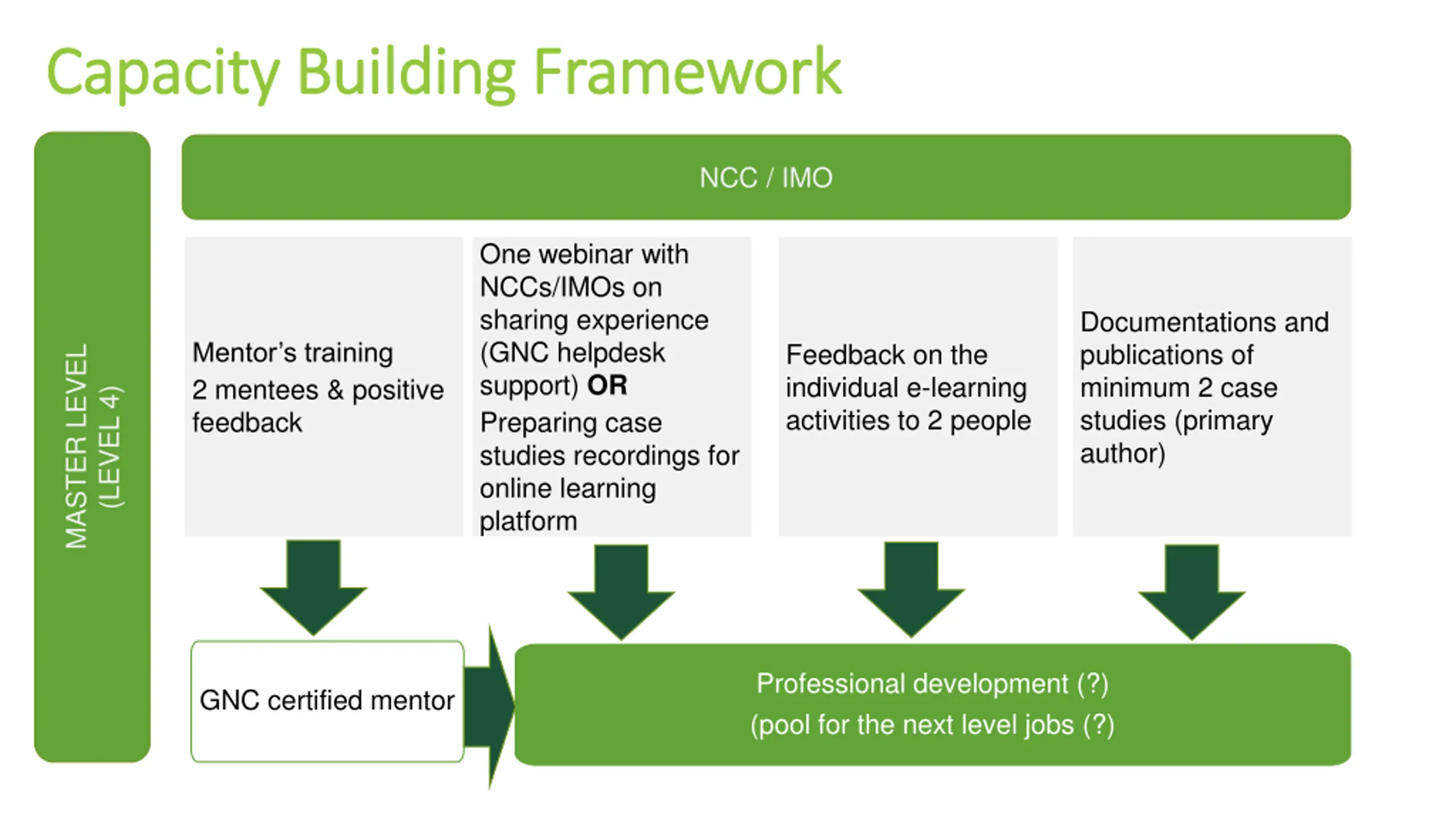 Capacity Building Framework Capacity Building Framework NCC / IMO One webinar with NCCs/IMOs on sharing experience (GNC helpdesk support) OR Preparing case studies recordings for online learning platform Documentations and publications of minimum 2 case studies (primary author) Mentor s training 2 mentees & positive feedback MASTER LEVEL Feedback on the individual e-learning activities to 2 people (LEVEL 4) Professional development (?) (pool for the next level jobs (?) GNC certified mentor