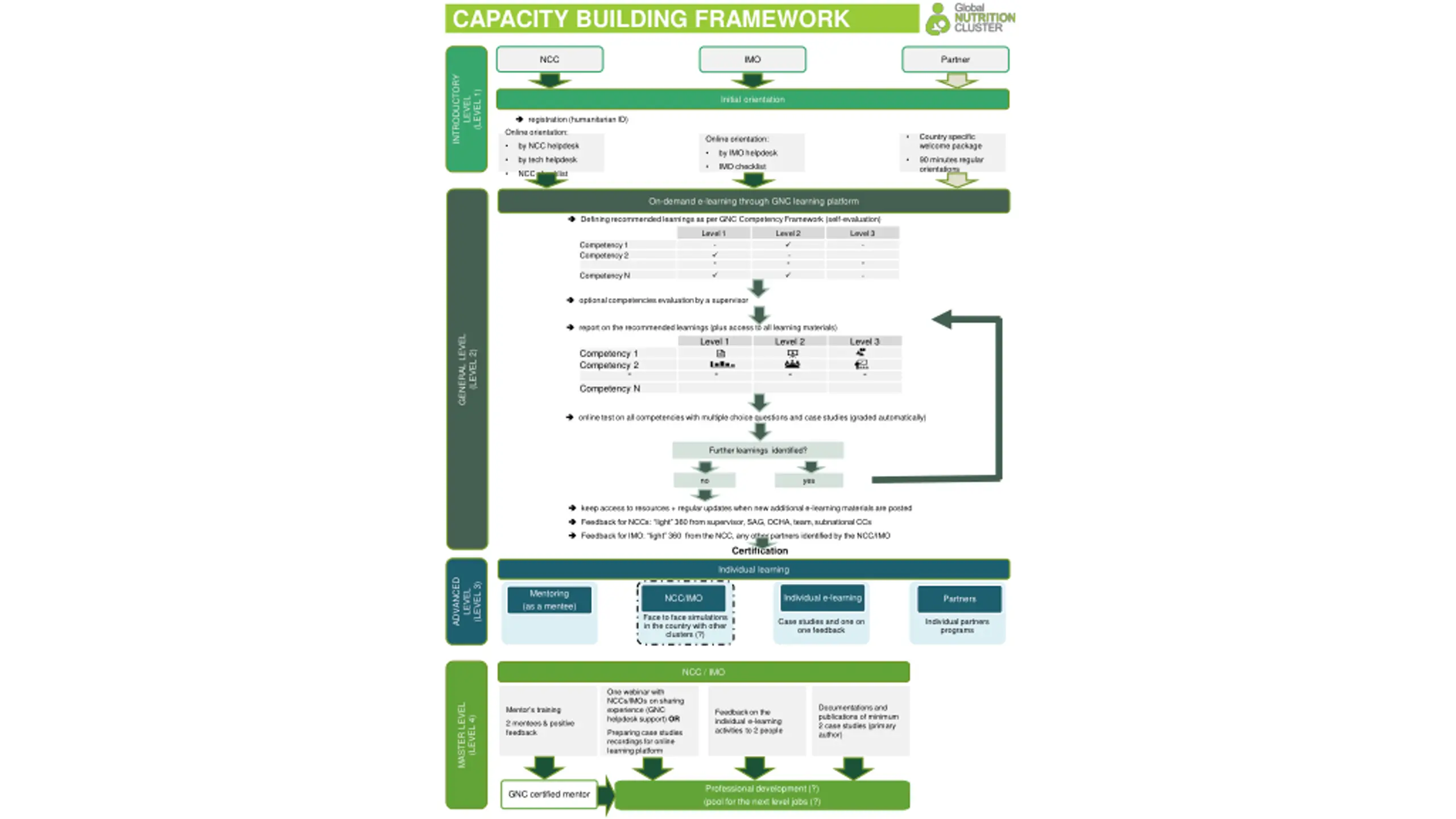 CAPACITY BUILDING FRAMEWORK NCC IMO Partner INTRODUCTORY (LEVEL 1) LEVEL Initial orientation registration (humanitarian ID) Online orientation: Country specific welcome package Online orientation: by NCC helpdesk by IMO helpdesk by tech helpdesk 90 minutes regular orientations IMO checklist NCC checklist On-demand e-learning through GNC learning platform Defining recommended learnings as per GNC Competency Framework (self-evaluation) Level 1 - Level 2 - Level 3 - Competency 1 Competency 2 - Competency N optional competencies evaluation by a supervisor report on the recommended learnings (plus access to all learning materials) GENERAL LEVEL Level 1 Level 2 Level 3 Competency 1 Competency 2 (LEVEL 2) Competency N online test on all competencies with multiple choice questions and case studies (graded automatically) Further learnings identified? no yes keep access to resources + regular updates when new additional e-learning materials are posted Feedback for NCCs: light 360 from supervisor, SAG, OCHA, team, subnational CCs Feedback for IMO: light 360 from the NCC, any other partners identified by the NCC/IMO Certification Individual learning ADVANCED (LEVEL 3) LEVEL Mentoring (as a mentee) Individual e-learning NCC/IMO Partners Face to face simulations in the country with other clusters (?) Case studies and one on one feedback Individual partners programs NCC / IMO One webinar with NCCs/IMOs on sharing experience (GNC helpdesk support) OR MASTER LEVEL Documentations and publications of minimum 2 case studies (primary author) Mentor s training Feedback on the individual e-learning activities to 2 people (LEVEL 4) 2 mentees & positive feedback Preparing case studies recordings for online learning platform Professional development (?) (pool for the next level jobs (?) GNC certified mentor