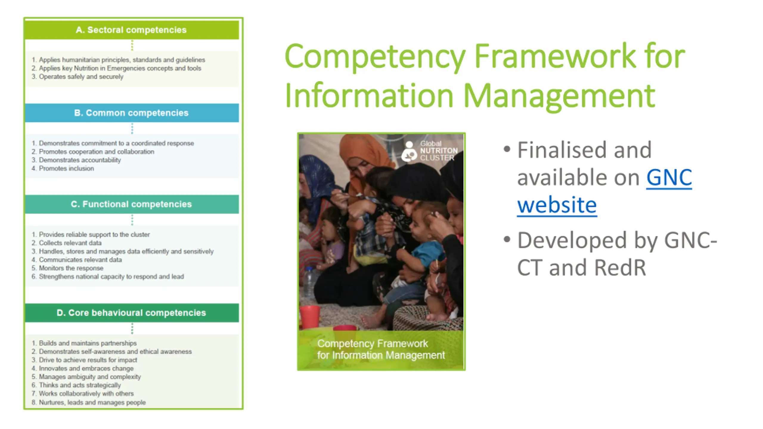 Competency Framework for Competency Framework for Information Management Information Management Finalised and available on GNC website Developed by GNC- CT and RedR