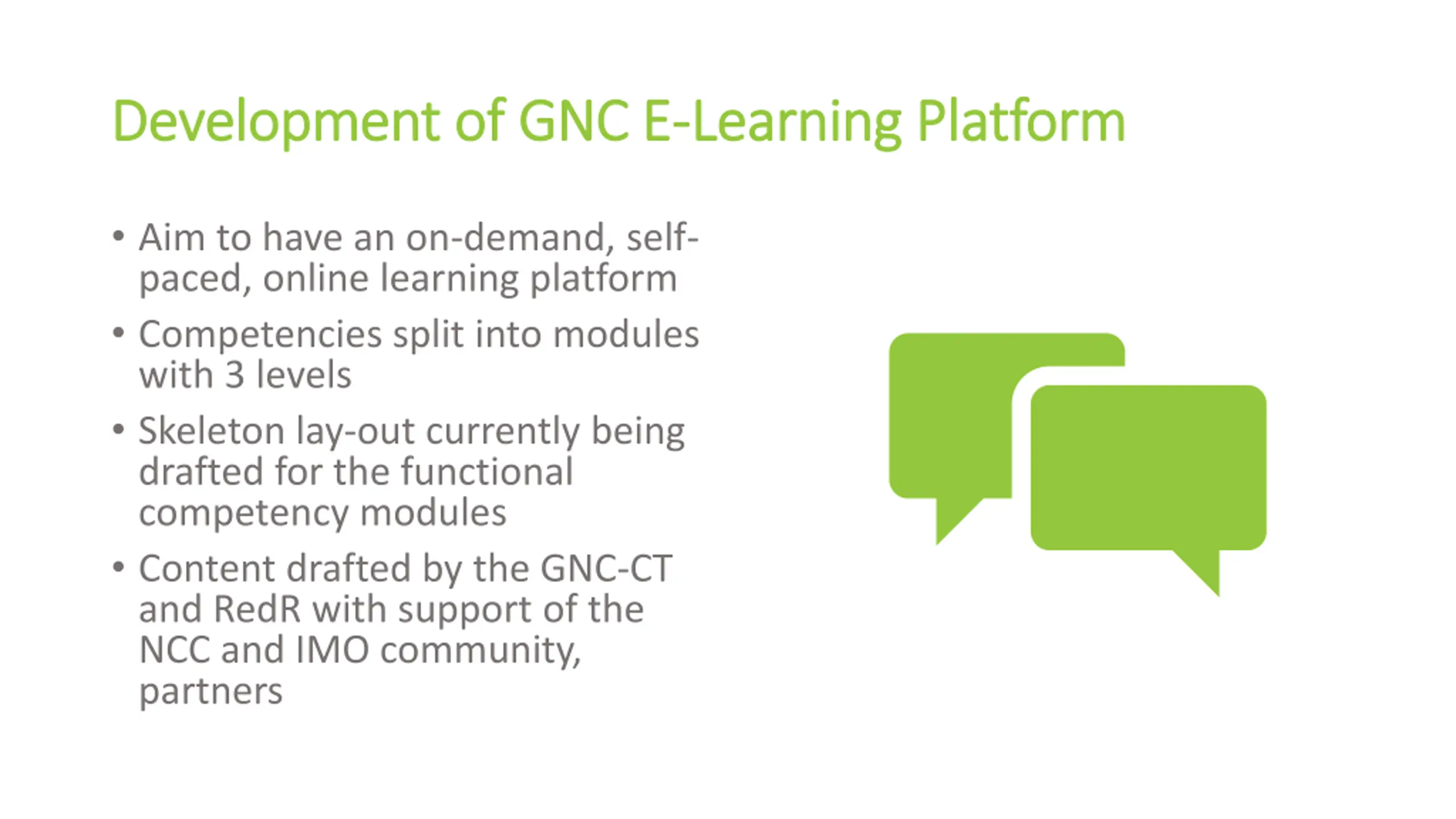 Development of GNC E Development of GNC E- -Learning Platform Learning Platform Aim to have an on-demand, self- paced, online learning platform Competencies split into modules with 3 levels Skeleton lay-out currently being drafted for the functional competency modules Content drafted by the GNC-CT and RedR with support of the NCC and IMO community, partners