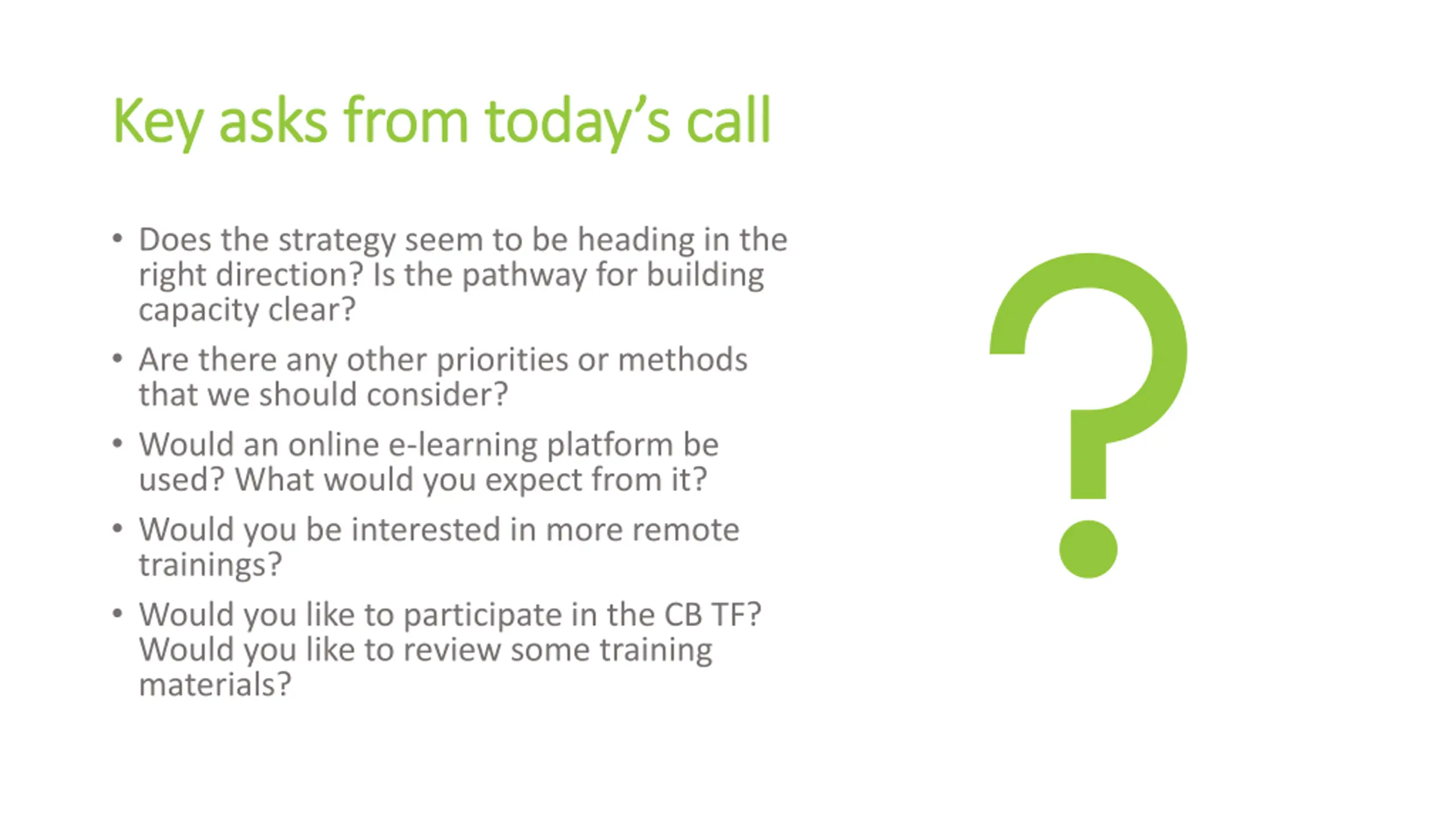 Key asks from todays call Key asks from today s call Does the strategy seem to be heading in the right direction? Is the pathway for building capacity clear? Are there any other priorities or methods that we should consider? Would an online e-learning platform be used? What would you expect from it? Would you be interested in more remote trainings? Would you like to participate in the CB TF? Would you like to review some training materials?