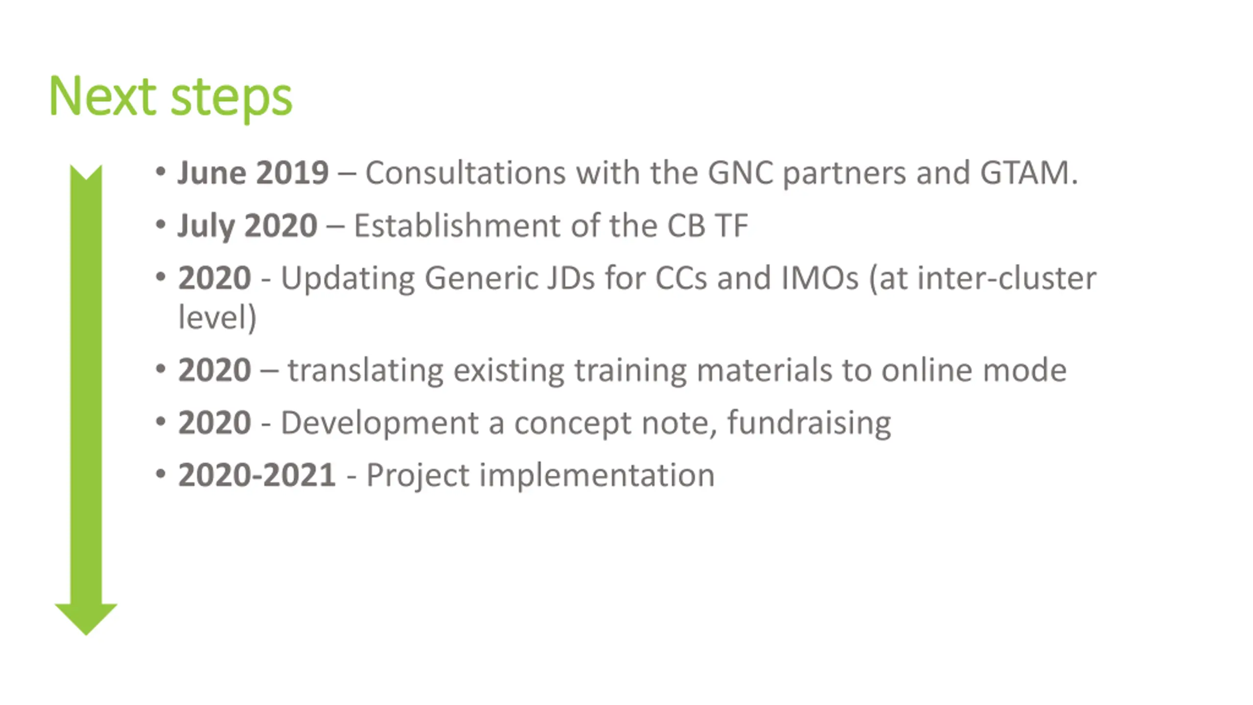 Next steps Next steps June 2019 Consultations with the GNC partners and GTAM. July 2020 Establishment of the CB TF 2020 - Updating Generic JDs for CCs and IMOs (at inter-cluster level) 2020 translating existing training materials to online mode 2020 - Development a concept note, fundraising 2020-2021 - Project implementation
