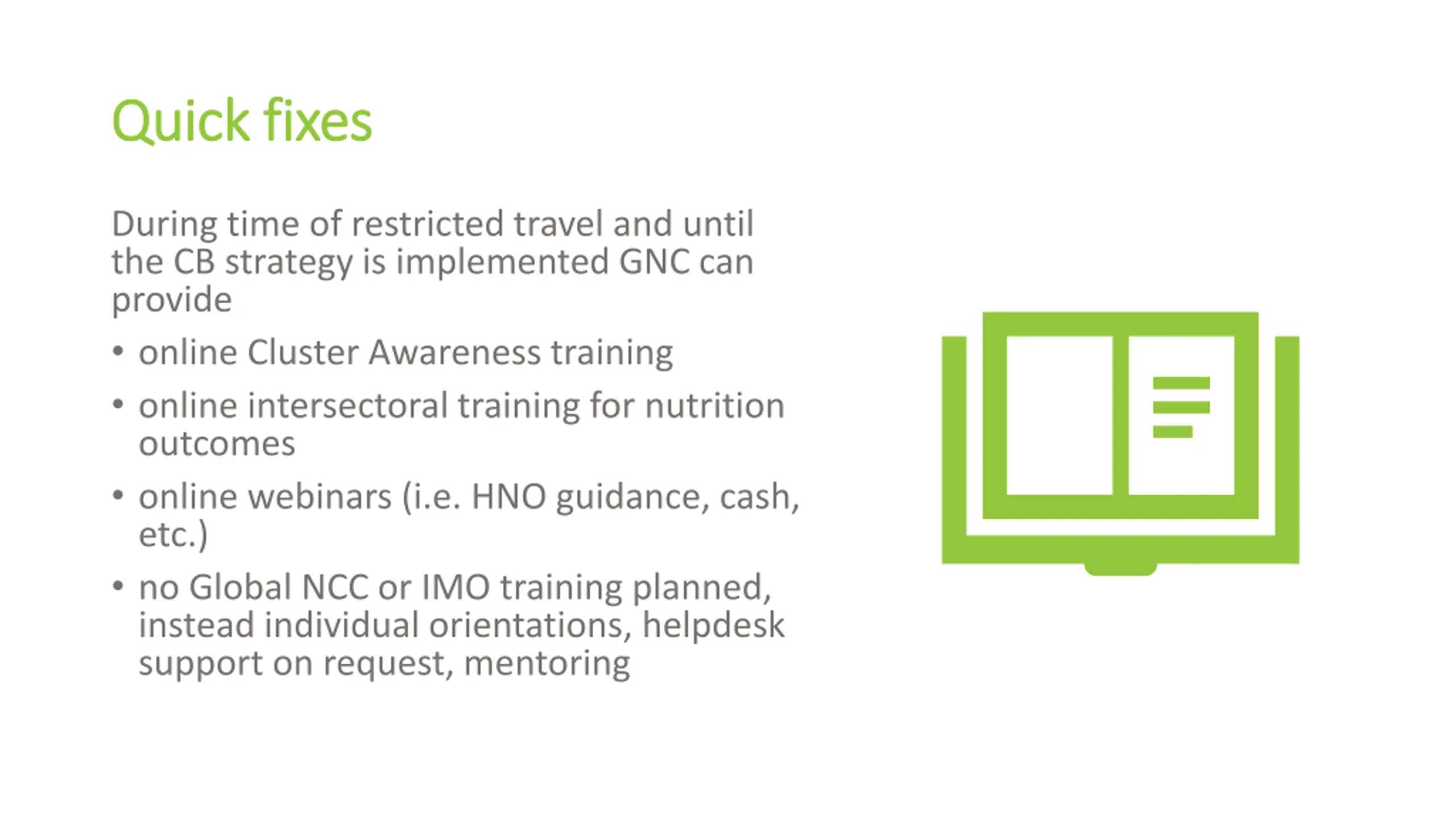 Quick fixes Quick fixes During time of restricted travel and until the CB strategy is implemented GNC can provide online Cluster Awareness training online intersectoral training for nutrition outcomes online webinars (i.e. HNO guidance, cash, etc.) no Global NCC or IMO training planned, instead individual orientations, helpdesk support on request, mentoring