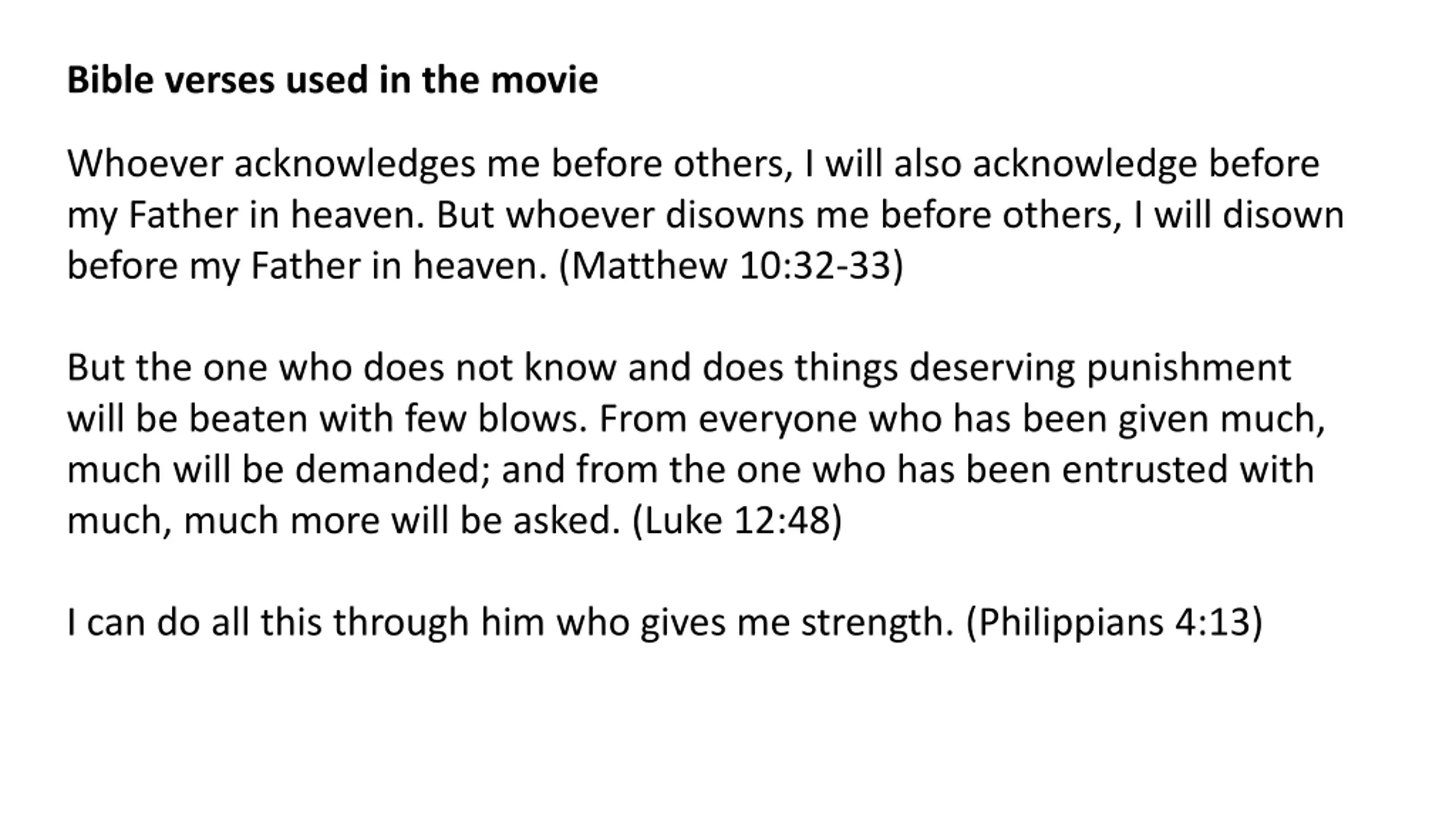 Bible verses used in the movie Whoever acknowledges me before others, I will also acknowledge before my Father in heaven. But whoever disowns me before others, I will disown before my Father in heaven. (Matthew 10:32-33) But the one who does not know and does things deserving punishment will be beaten with few blows. From everyone who has been given much, much will be demanded; and from the one who has been entrusted with much, much more will be asked. (Luke 12:48) I can do all this through him who gives me strength. (Philippians 4:13)