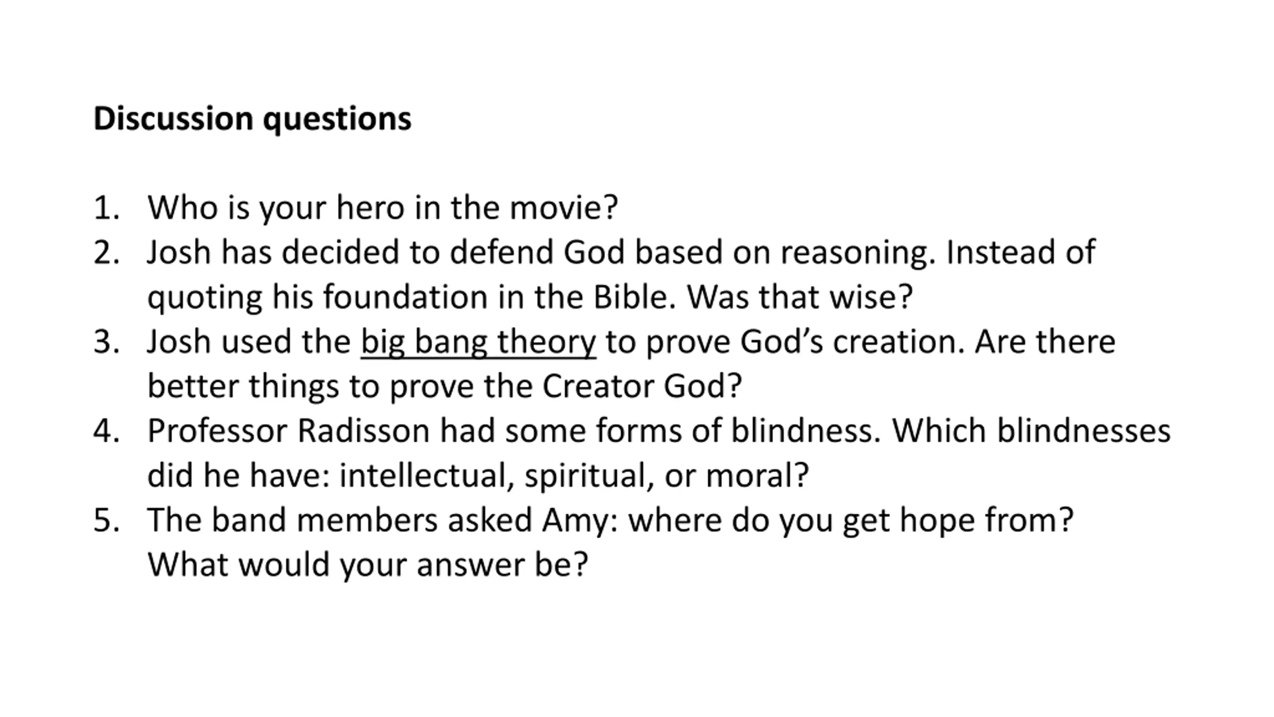 Discussion questions 1. Who is your hero in the movie? 2. Josh has decided to defend God based on reasoning. Instead of quoting his foundation in the Bible. Was that wise? 3. Josh used the big bang theory to prove God s creation. Are there better things to prove the Creator God? 4. Professor Radisson had some forms of blindness. Which blindnesses did he have: intellectual, spiritual, or moral? 5. The band members asked Amy: where do you get hope from? What would your answer be?