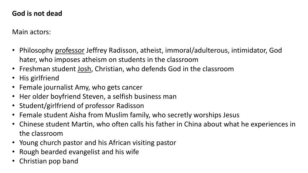 God is not dead Main actors: Philosophy professor Jeffrey Radisson, atheist, immoral/adulterous, intimidator, God hater, who imposes atheism on students in the classroom Freshman student Josh, Christian, who defends God in the classroom His girlfriend Female journalist Amy, who gets cancer Her older boyfriend Steven, a selfish business man Student/girlfriend of professor Radisson Female student Aisha from Muslim family, who secretly worships Jesus Chinese student Martin, who often calls his father in China about what he experiences in the classroom Young church pastor and his African visiting pastor Rough bearded evangelist and his wife Christian pop band