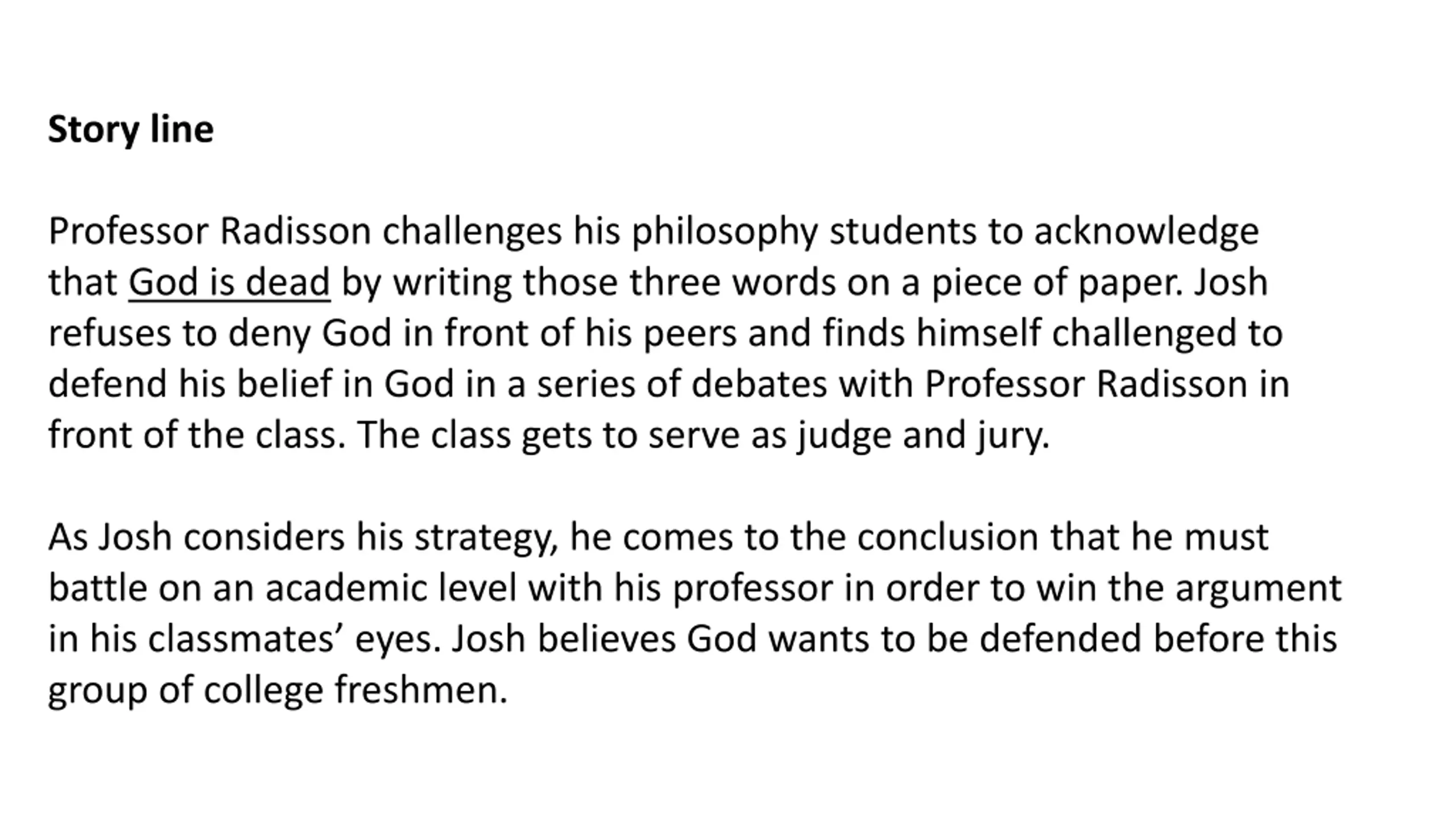 Story line Professor Radisson challenges his philosophy students to acknowledge that God is dead by writing those three words on a piece of paper. Josh refuses to deny God in front of his peers and finds himself challenged to defend his belief in God in a series of debates with Professor Radisson in front of the class. The class gets to serve as judge and jury. As Josh considers his strategy, he comes to the conclusion that he must battle on an academic level with his professor in order to win the argument in his classmates eyes. Josh believes God wants to be defended before this group of college freshmen.