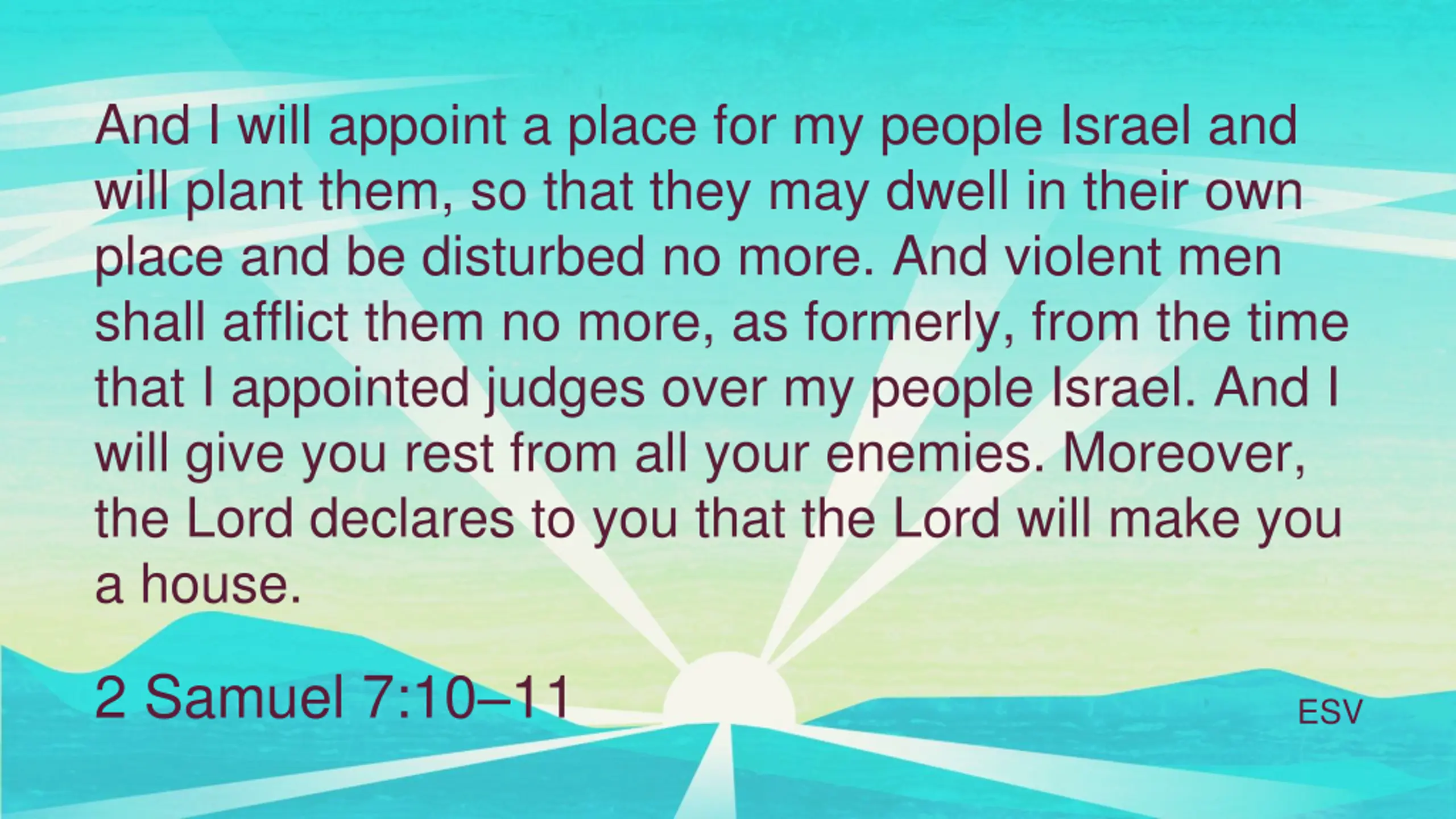 And I will appoint a place for my people Israel and will plant them, so that they may dwell in their own place and be disturbed no more. And violent men shall afflict them no more, as formerly, from the time that I appointed judges over my people Israel. And I will give you rest from all your enemies. Moreover, the Lord declares to you that the Lord will make you a house. 2 Samuel 7:10 11 ESV