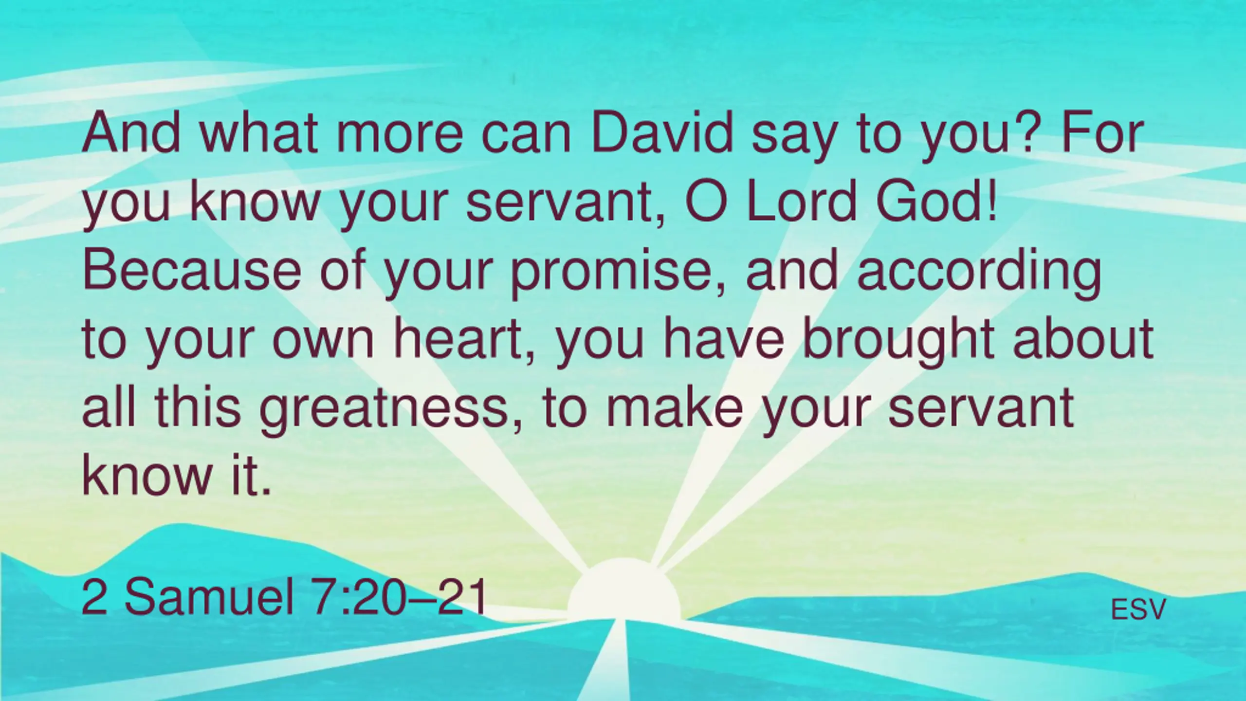 And what more can David say to you? For you know your servant, O Lord God! Because of your promise, and according to your own heart, you have brought about all this greatness, to make your servant know it. 2 Samuel 7:20 21 ESV