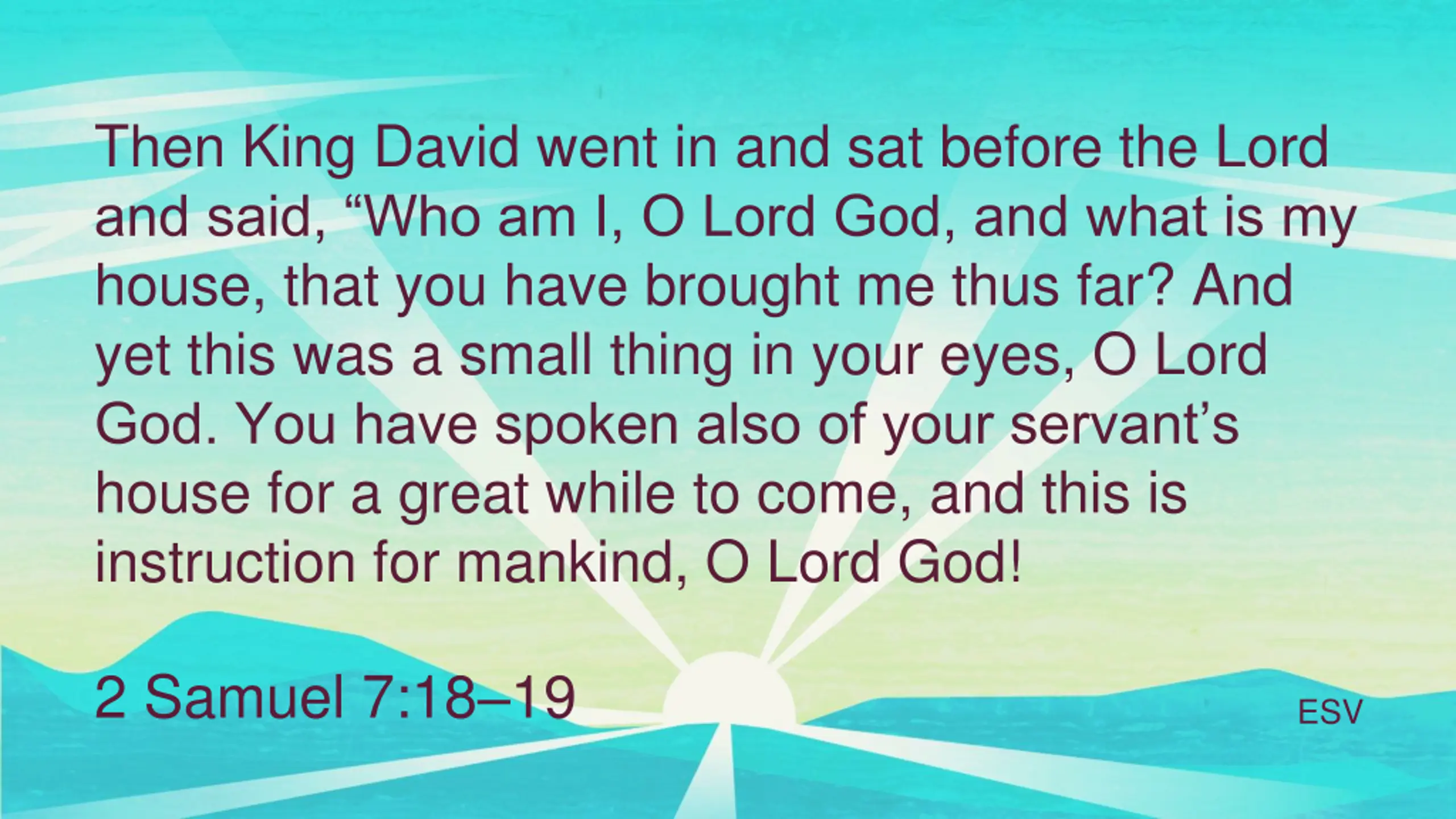 Then King David went in and sat before the Lord and said, Who am I, O Lord God, and what is my house, that you have brought me thus far? And yet this was a small thing in your eyes, O Lord God. You have spoken also of your servant s house for a great while to come, and this is instruction for mankind, O Lord God! 2 Samuel 7:18 19 ESV