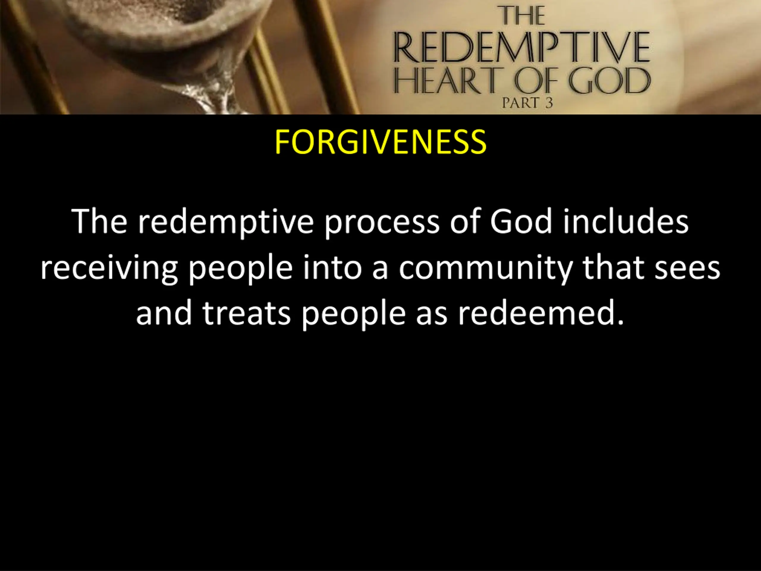 FORGIVENESS The redemptive process of God includes receiving people into a community that sees and treats people as redeemed.