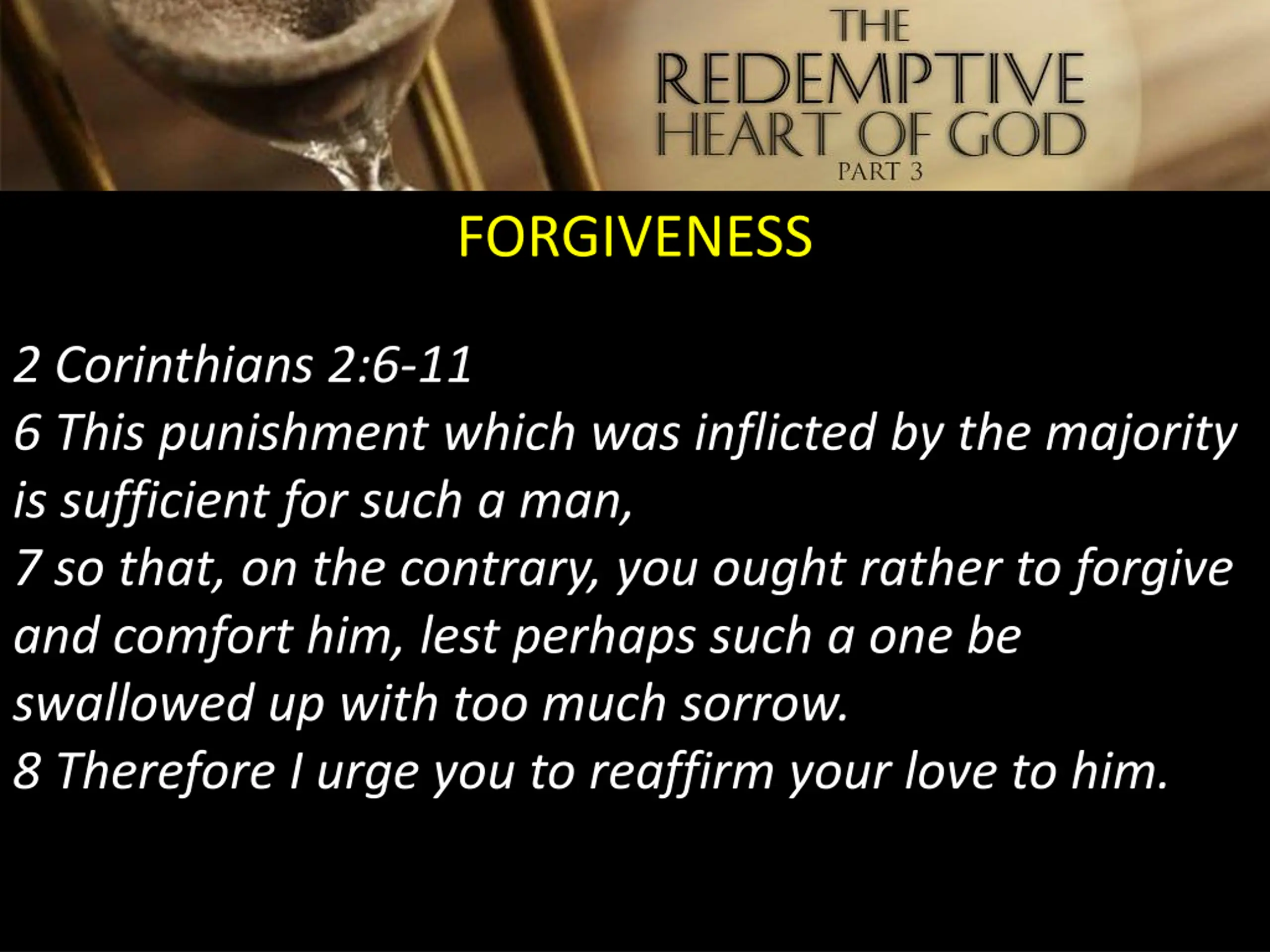 FORGIVENESS 2 Corinthians 2:6-11 6 This punishment which was inflicted by the majority is sufficient for such a man, 7 so that, on the contrary, you ought rather to forgive and comfort him, lest perhaps such a one be swallowed up with too much sorrow. 8 Therefore I urge you to reaffirm your love to him.