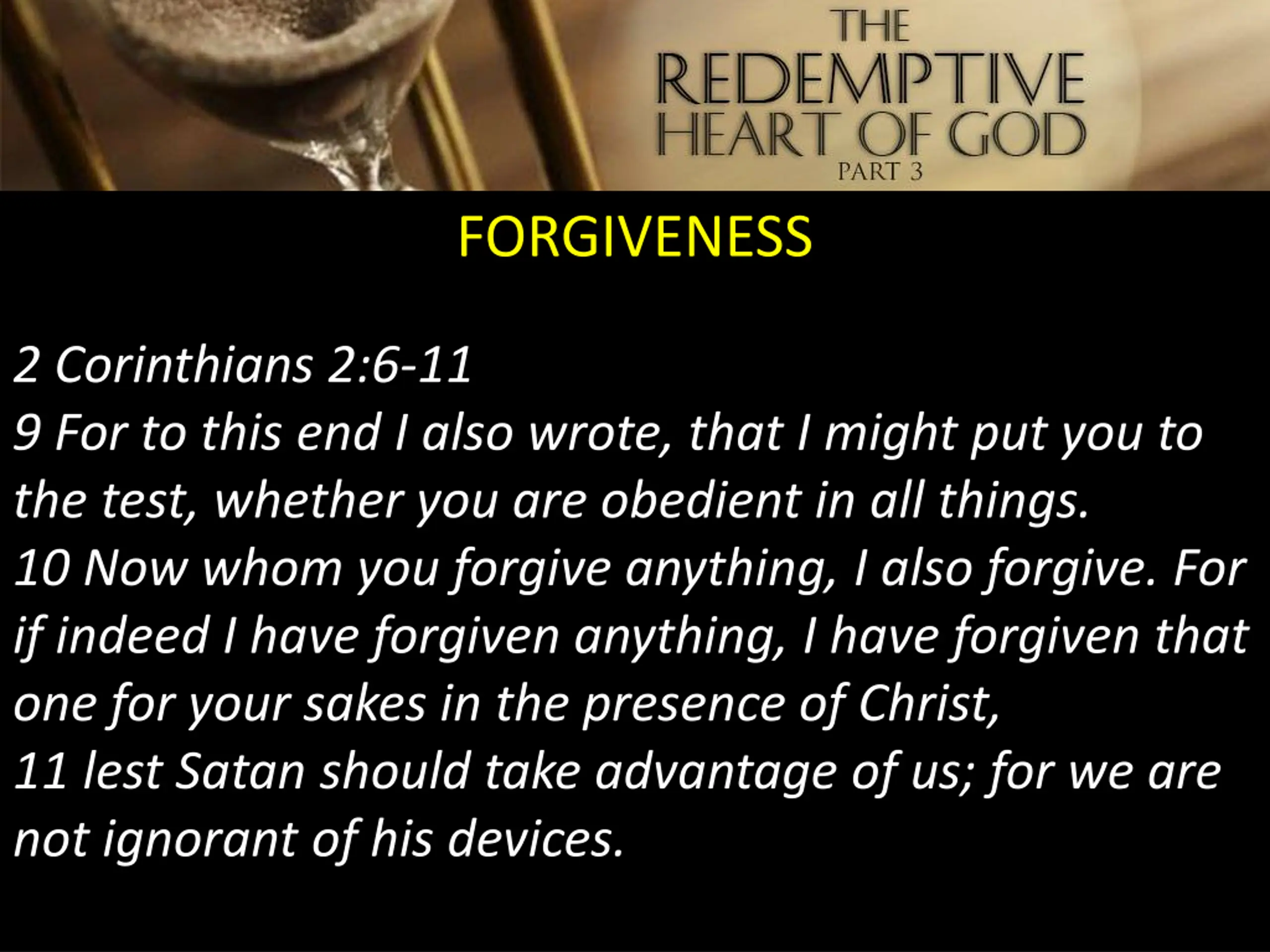 FORGIVENESS 2 Corinthians 2:6-11 9 For to this end I also wrote, that I might put you to the test, whether you are obedient in all things. 10 Now whom you forgive anything, I also forgive. For if indeed I have forgiven anything, I have forgiven that one for your sakes in the presence of Christ, 11 lest Satan should take advantage of us; for we are not ignorant of his devices.
