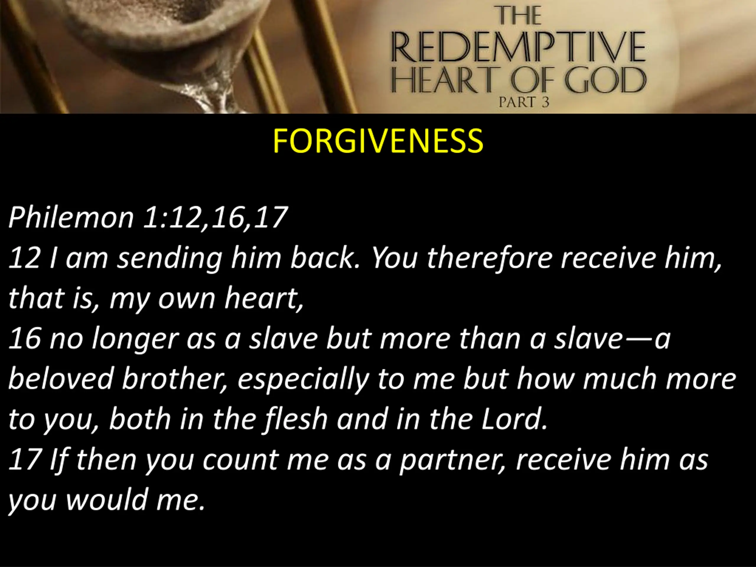 FORGIVENESS Philemon 1:12,16,17 12 I am sending him back. You therefore receive him, that is, my own heart, 16 no longer as a slave but more than a slave a beloved brother, especially to me but how much more to you, both in the flesh and in the Lord. 17 If then you count me as a partner, receive him as you would me.