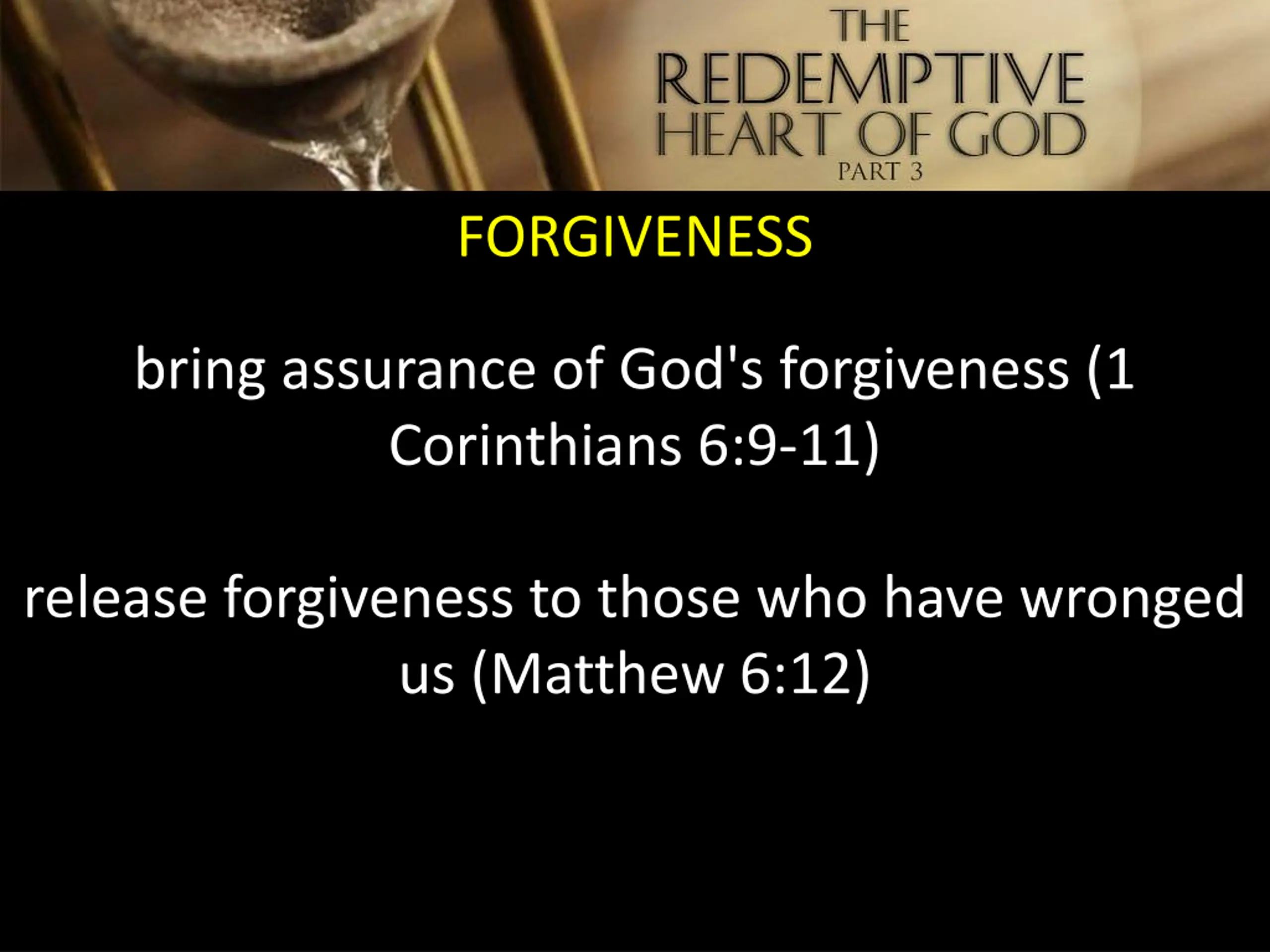 FORGIVENESS bring assurance of God's forgiveness (1 Corinthians 6:9-11) release forgiveness to those who have wronged us (Matthew 6:12)