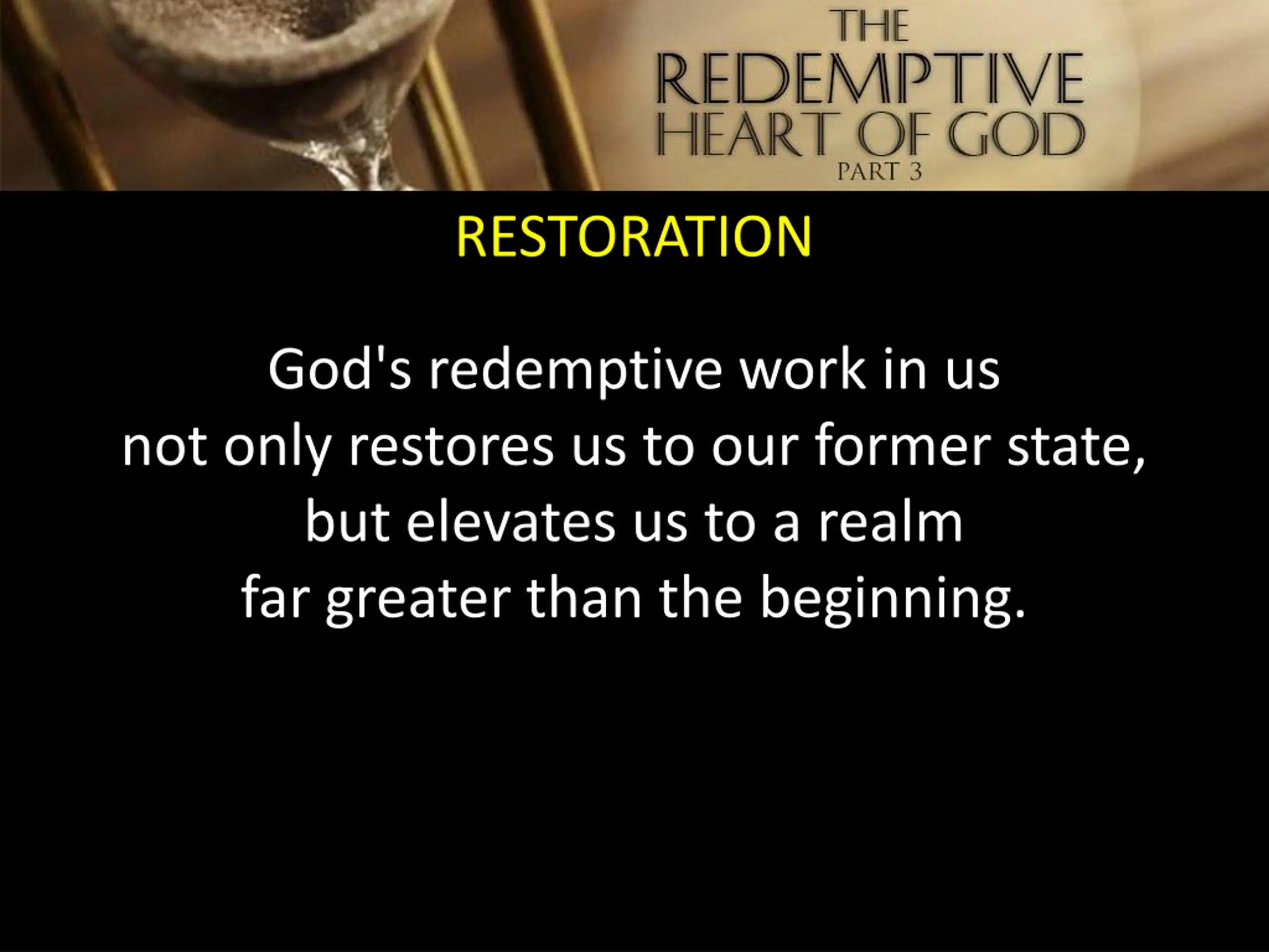 RESTORATION God's redemptive work in us not only restores us to our former state, but elevates us to a realm far greater than the beginning.