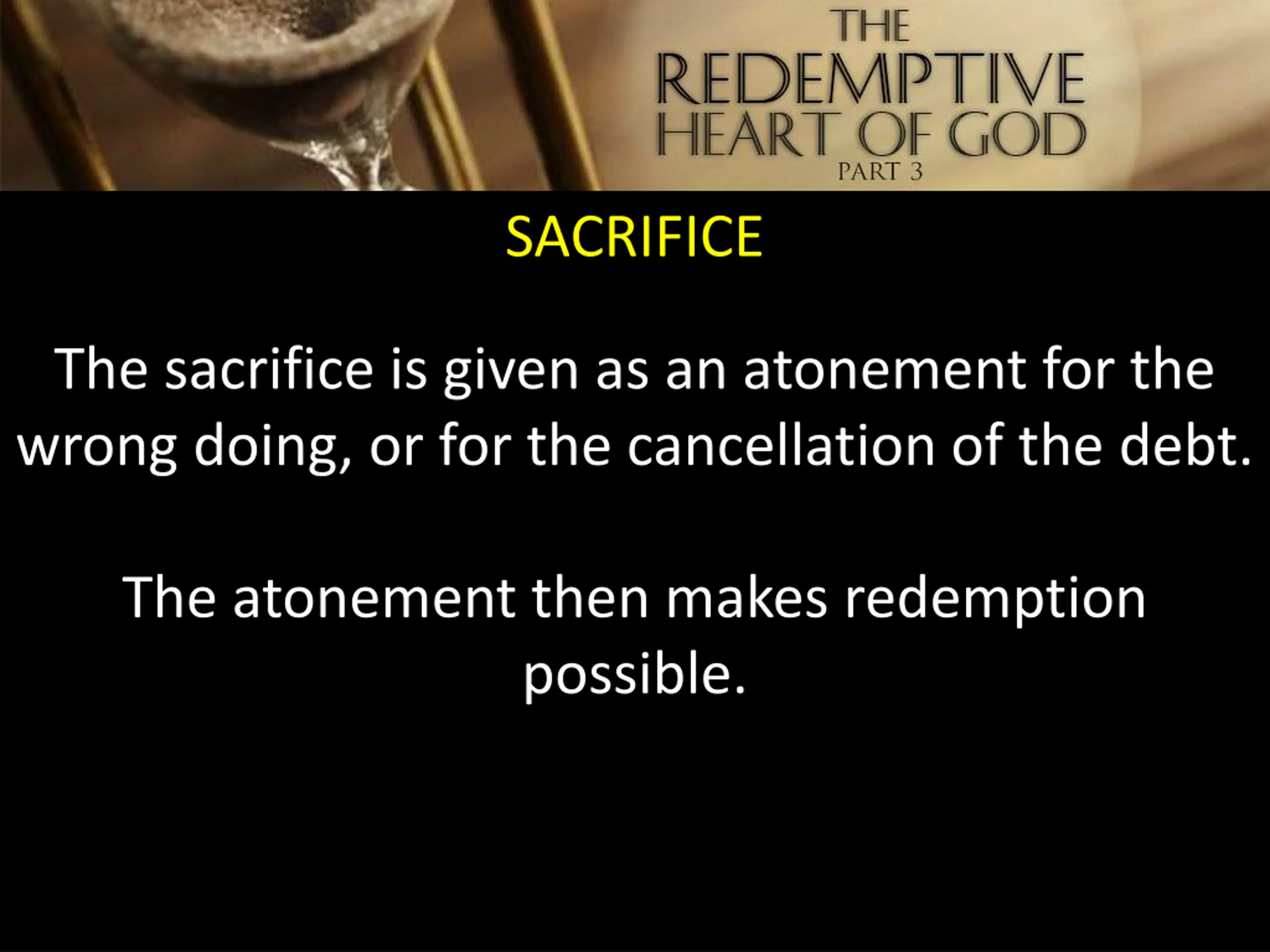 SACRIFICE The sacrifice is given as an atonement for the wrong doing, or for the cancellation of the debt. The atonement then makes redemption possible.