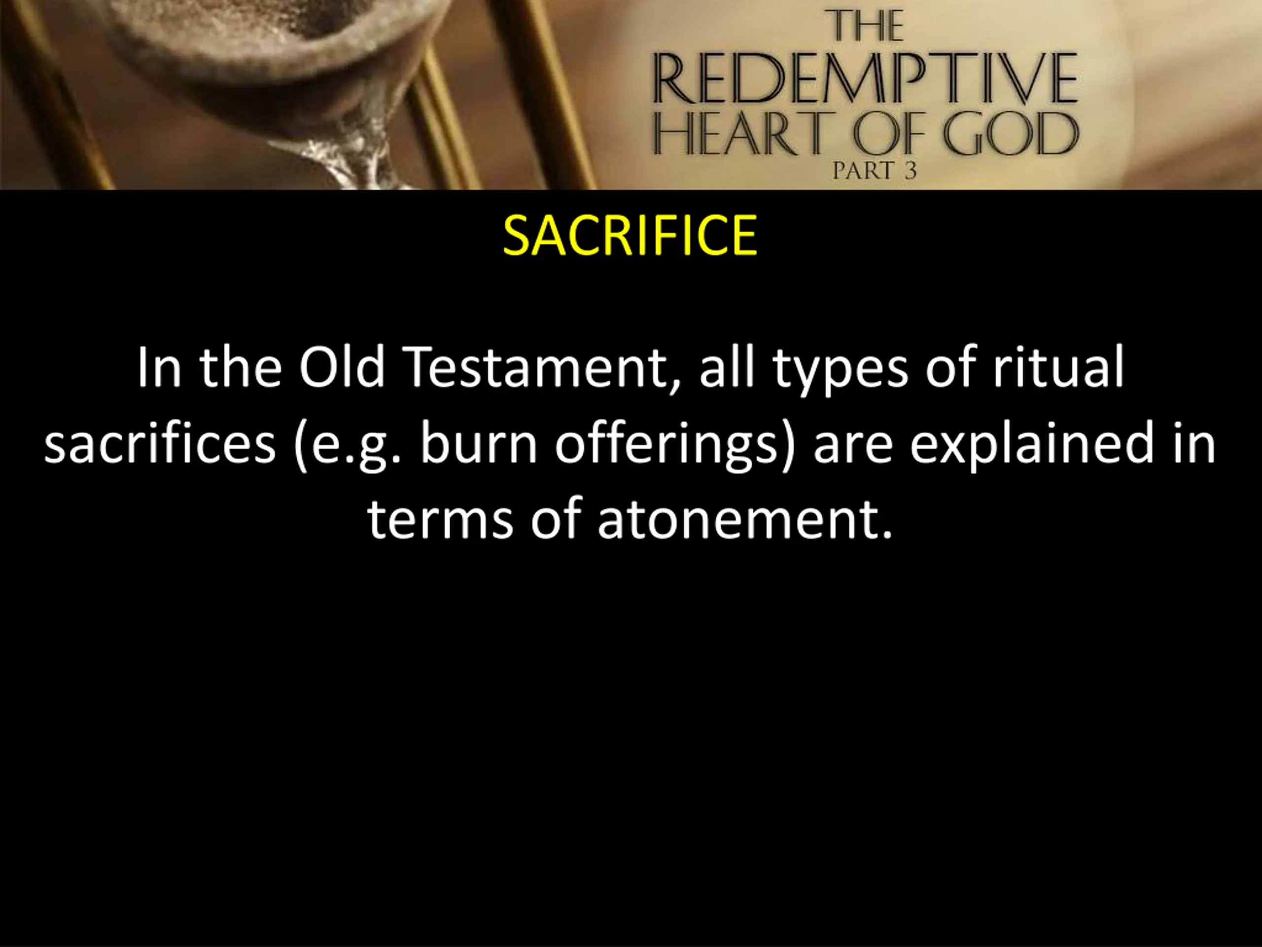 SACRIFICE In the Old Testament, all types of ritual sacrifices (e.g. burn offerings) are explained in terms of atonement.