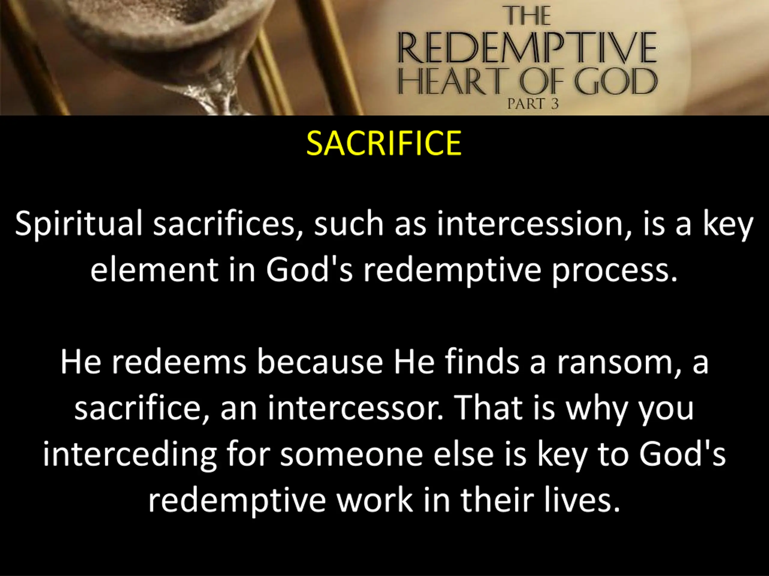 SACRIFICE Spiritual sacrifices, such as intercession, is a key element in God's redemptive process. He redeems because He finds a ransom, a sacrifice, an intercessor. That is why you interceding for someone else is key to God's redemptive work in their lives.
