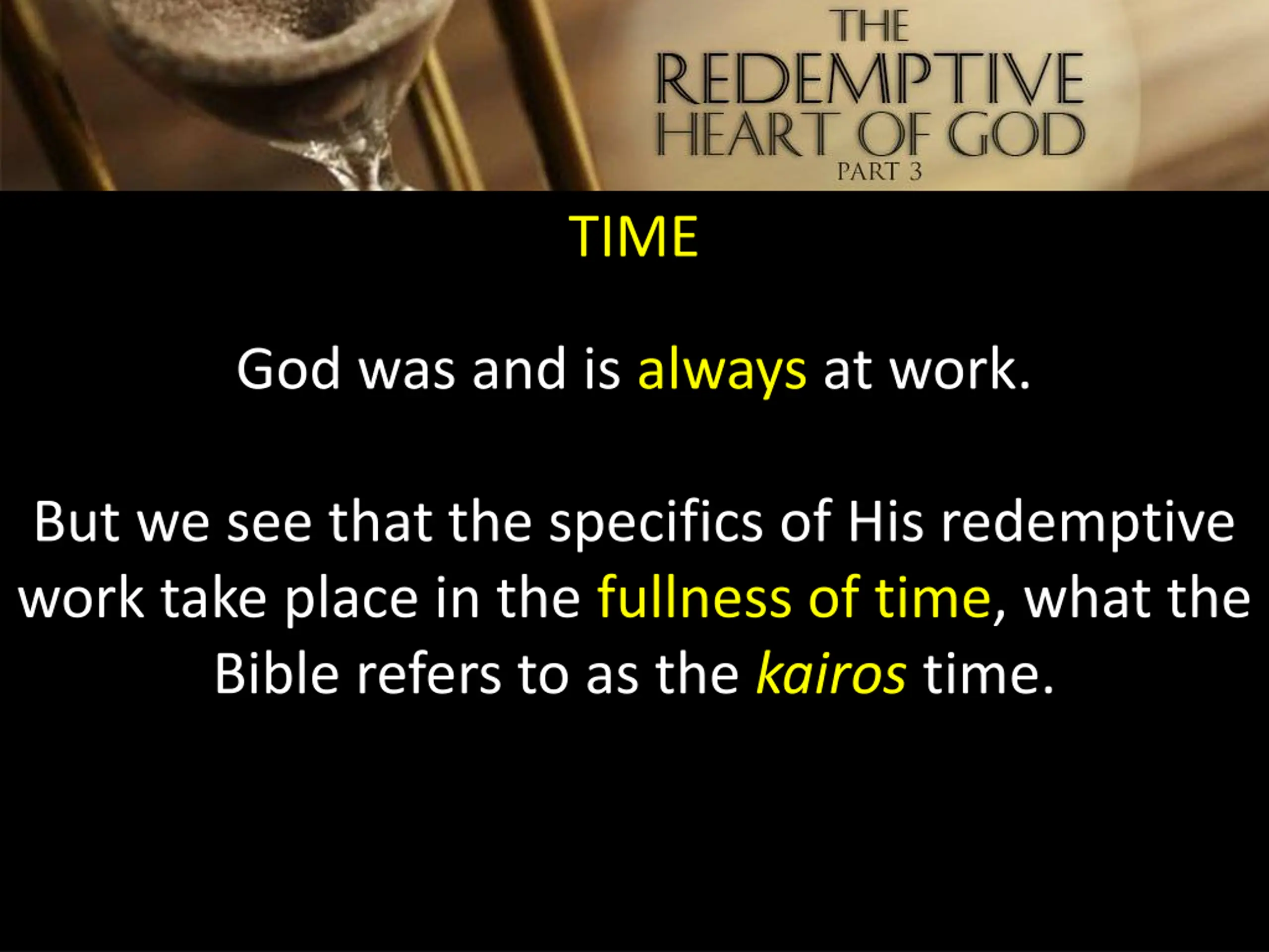 TIME God was and is always at work. But we see that the specifics of His redemptive work take place in the fullness of time, what the Bible refers to as the kairos time.