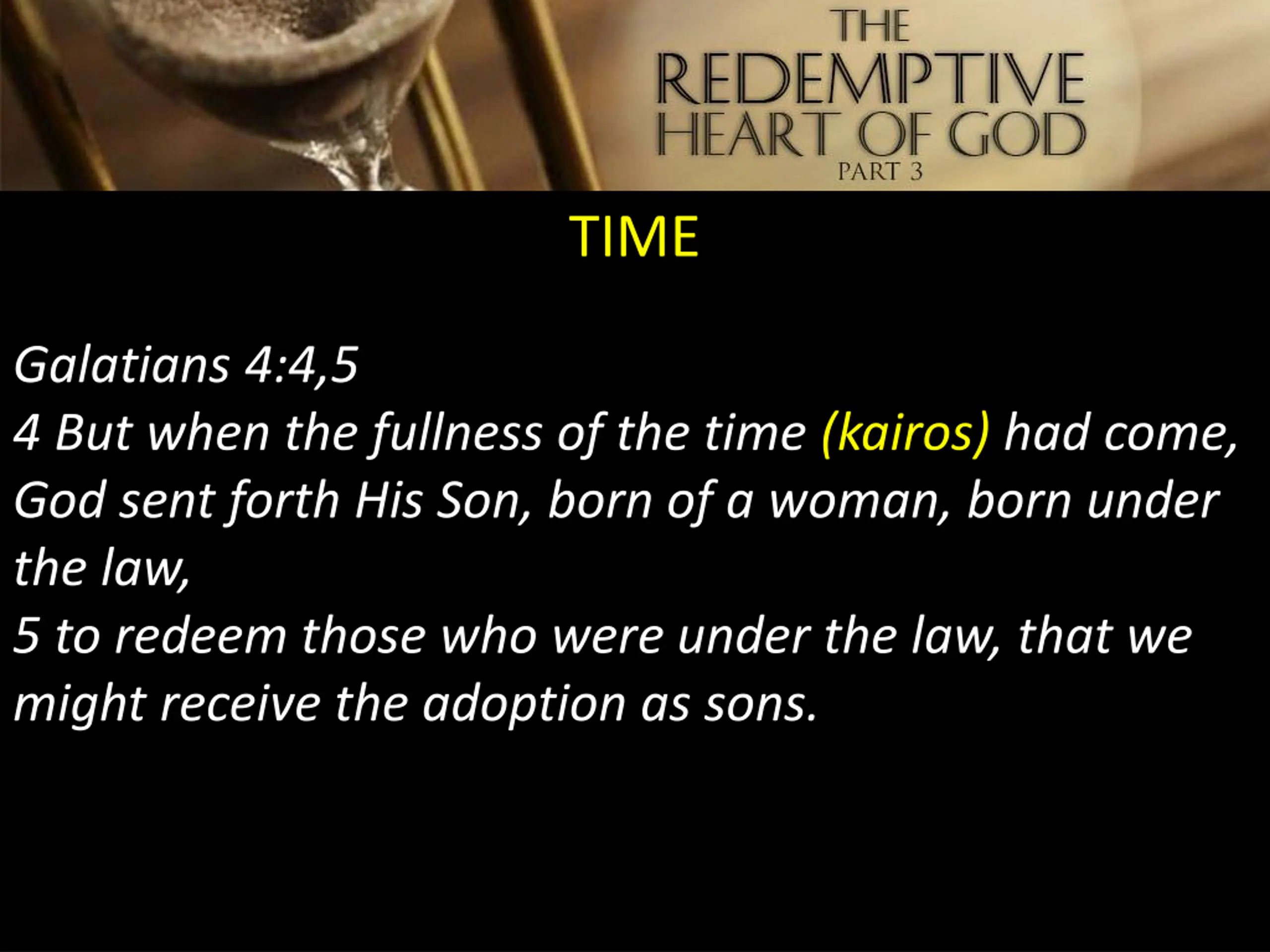 TIME Galatians 4:4,5 4 But when the fullness of the time (kairos) had come, God sent forth His Son, born of a woman, born under the law, 5 to redeem those who were under the law, that we might receive the adoption as sons.