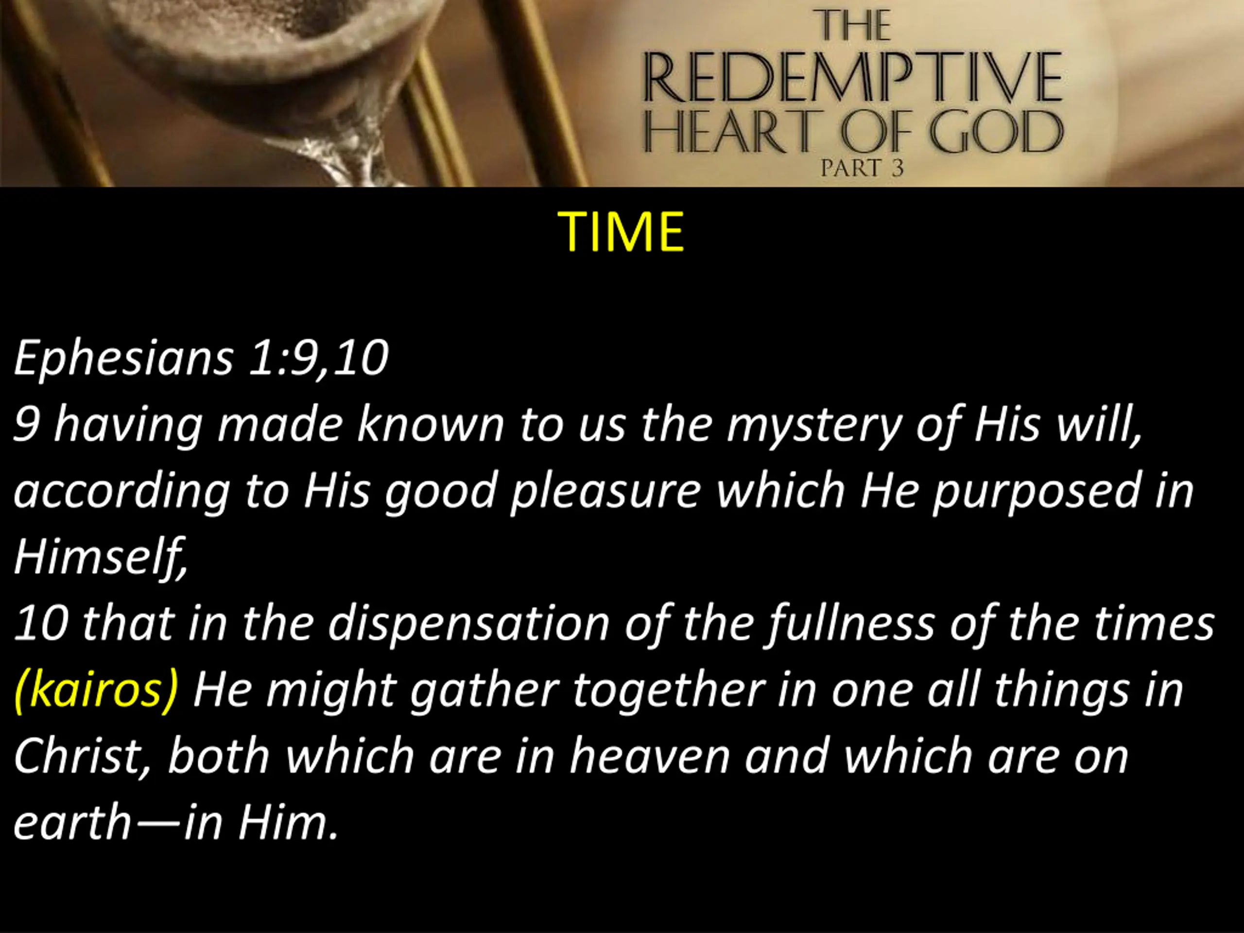 TIME Ephesians 1:9,10 9 having made known to us the mystery of His will, according to His good pleasure which He purposed in Himself, 10 that in the dispensation of the fullness of the times (kairos) He might gather together in one all things in Christ, both which are in heaven and which are on earth in Him.