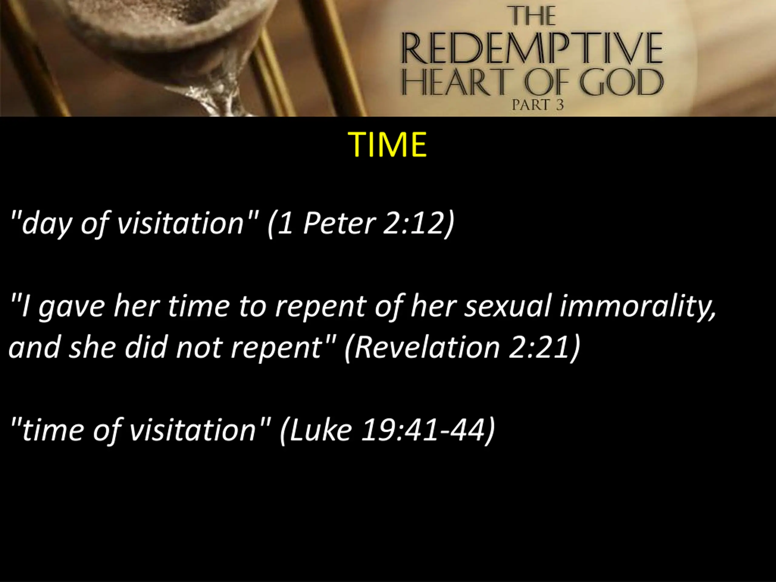 TIME "day of visitation" (1 Peter 2:12) "I gave her time to repent of her sexual immorality, and she did not repent" (Revelation 2:21) "time of visitation" (Luke 19:41-44)