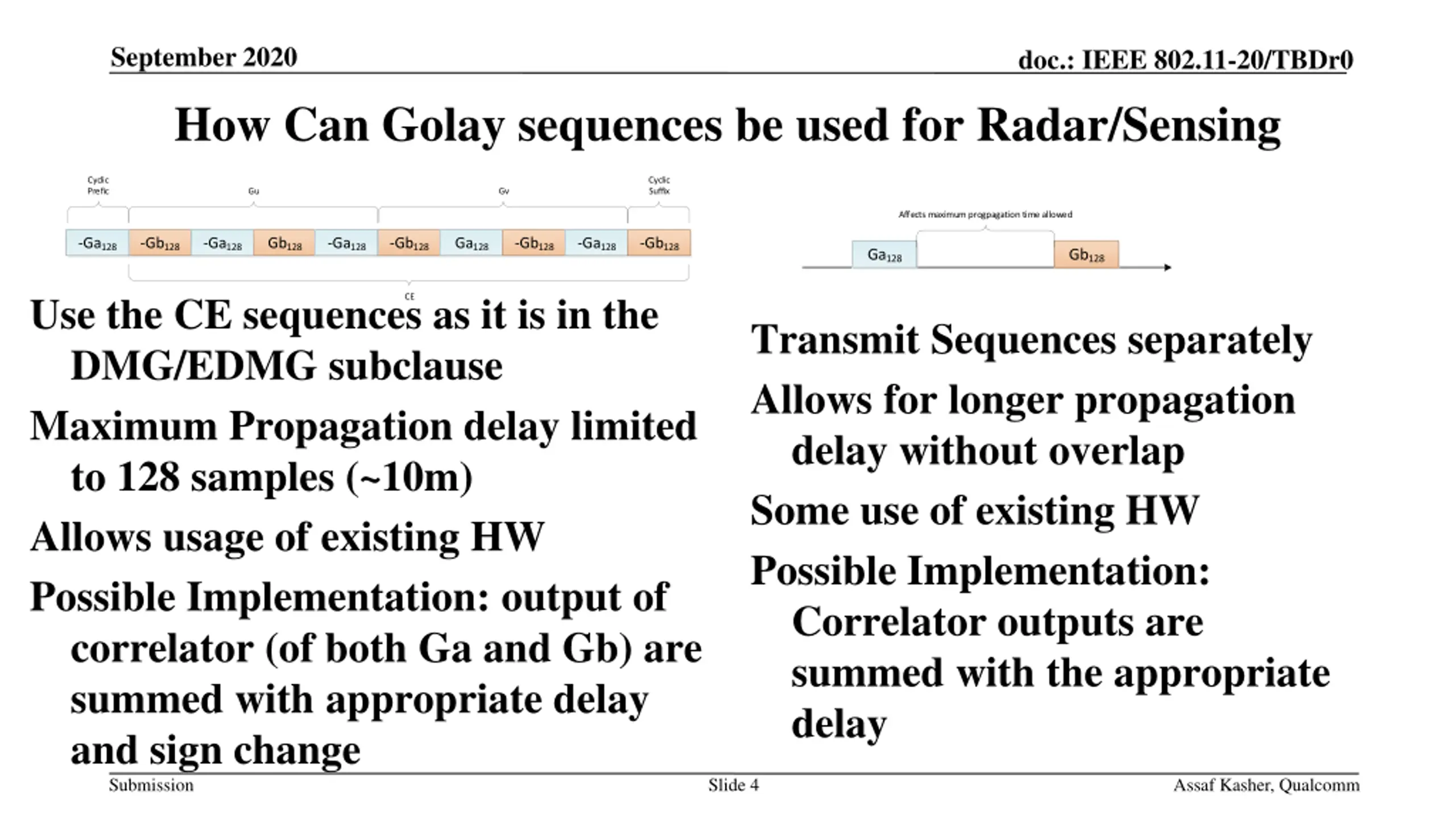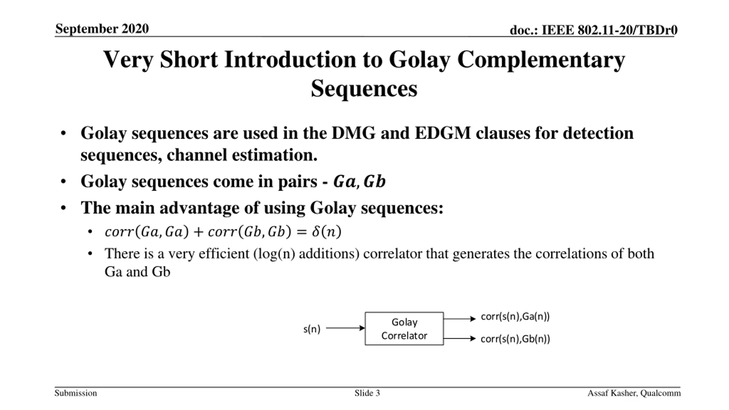 September 2020 doc.: IEEE 802.11-20/TBDr0 Golay Sequences and Ambiguity Function Date: 2020-09-07 Authors: Name Assaf Kasher Alecsander Eitan Solomon Trainin Affiliations Qualcomm Qualcomm Qualcomm Address Phone email akasher@qti.qualcomm.com eitana@qti.qualcomm.com strainin@qti.qualcomm.com Submission Slide 1 Assaf Kasher, Qualcomm