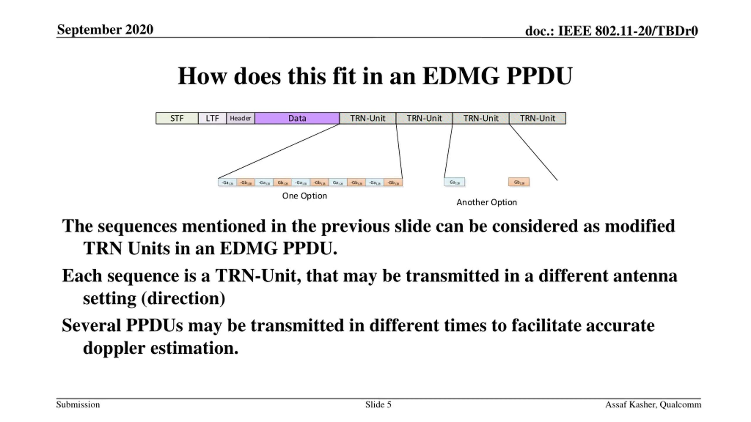 September 2020 doc.: IEEE 802.11-20/TBDr0 How does this fit in an EDMG PPDU STF LTF Data TRN-Unit TRN-Unit TRN-Unit TRN-Unit Header Ga128 Gb128 -Ga128 -Gb128 -Ga128 Gb128 -Ga128 -Gb128 Ga128 -Gb128 -Ga128 -Gb128 One Option Another Option The sequences mentioned in the previous slide can be considered as modified TRN Units in an EDMG PPDU. Each sequence is a TRN-Unit, that may be transmitted in a different antenna setting (direction) Several PPDUs may be transmitted in different times to facilitate accurate doppler estimation. Submission Slide 5 Assaf Kasher, Qualcomm