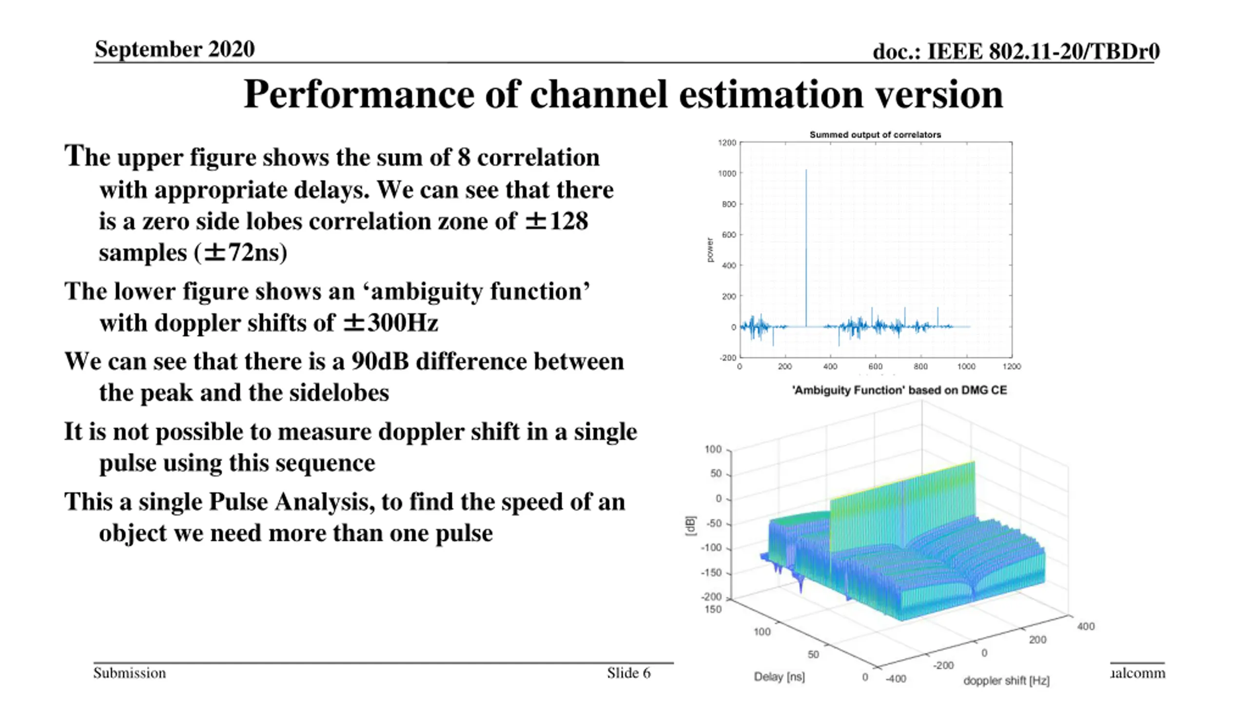 September 2020 doc.: IEEE 802.11-20/TBDr0 Performance of channel estimation version The upper figure shows the sum of 8 correlation with appropriate delays. We can see that there is a zero side lobes correlation zone of samples ( 72ns) The lower figure shows an ambiguity function with doppler shifts of 300Hz We can see that there is a 90dB difference between the peak and the sidelobes It is not possible to measure doppler shift in a single pulse using this sequence This a single Pulse Analysis, to find the speed of an object we need more than one pulse 128 Submission Slide 6 Assaf Kasher, Qualcomm
