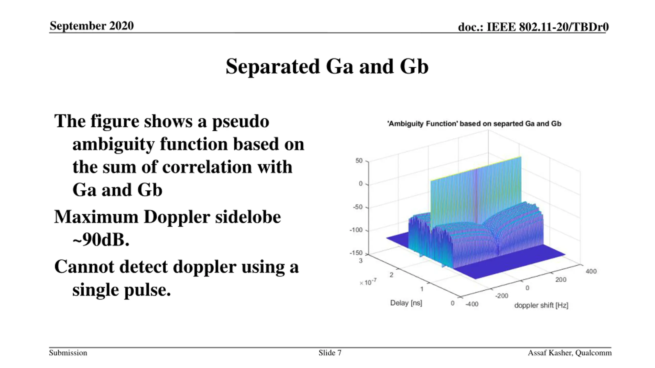 September 2020 doc.: IEEE 802.11-20/TBDr0 Separated Ga and Gb The figure shows a pseudo ambiguity function based on the sum of correlation with Ga and Gb Maximum Doppler sidelobe ~90dB. Cannot detect doppler using a single pulse. Submission Slide 7 Assaf Kasher, Qualcomm