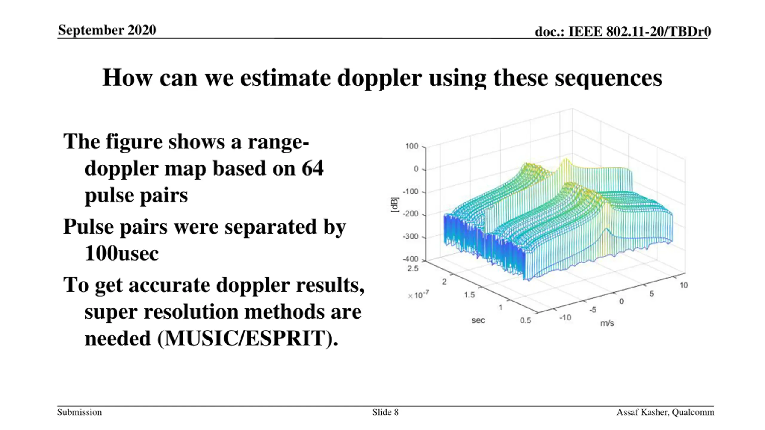September 2020 doc.: IEEE 802.11-20/TBDr0 How can we estimate doppler using these sequences The figure shows a range- doppler map based on 64 pulse pairs Pulse pairs were separated by 100usec To get accurate doppler results, super resolution methods are needed (MUSIC/ESPRIT). Submission Slide 8 Assaf Kasher, Qualcomm