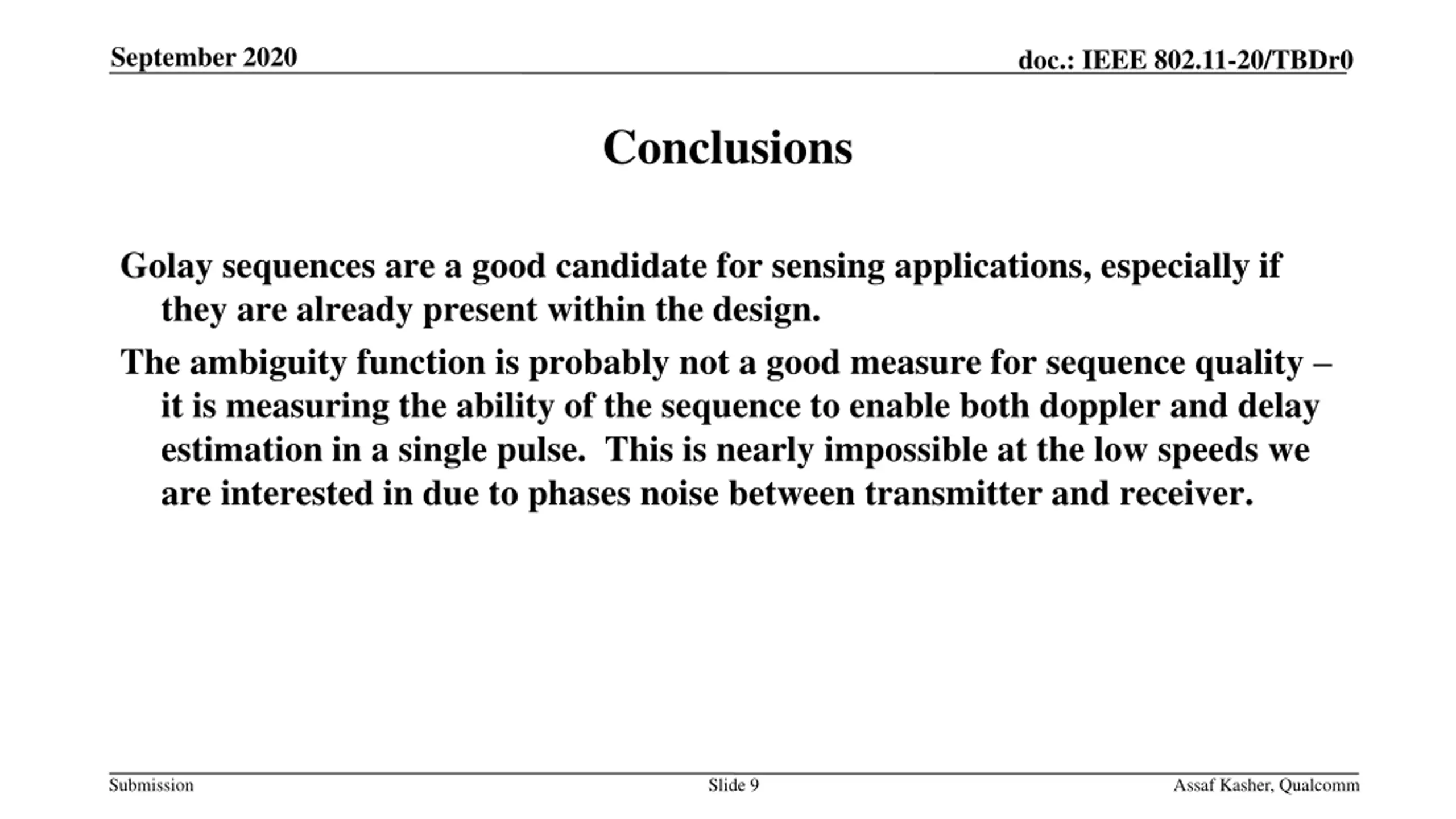September 2020 doc.: IEEE 802.11-20/TBDr0 Conclusions Golay sequences are a good candidate for sensing applications, especially if they are already present within the design. The ambiguity function is probably not a good measure for sequence quality it is measuring the ability of the sequence to enable both doppler and delay estimation in a single pulse. This is nearly impossible at the low speeds we are interested in due to phases noise between transmitter and receiver. Submission Slide 9 Assaf Kasher, Qualcomm