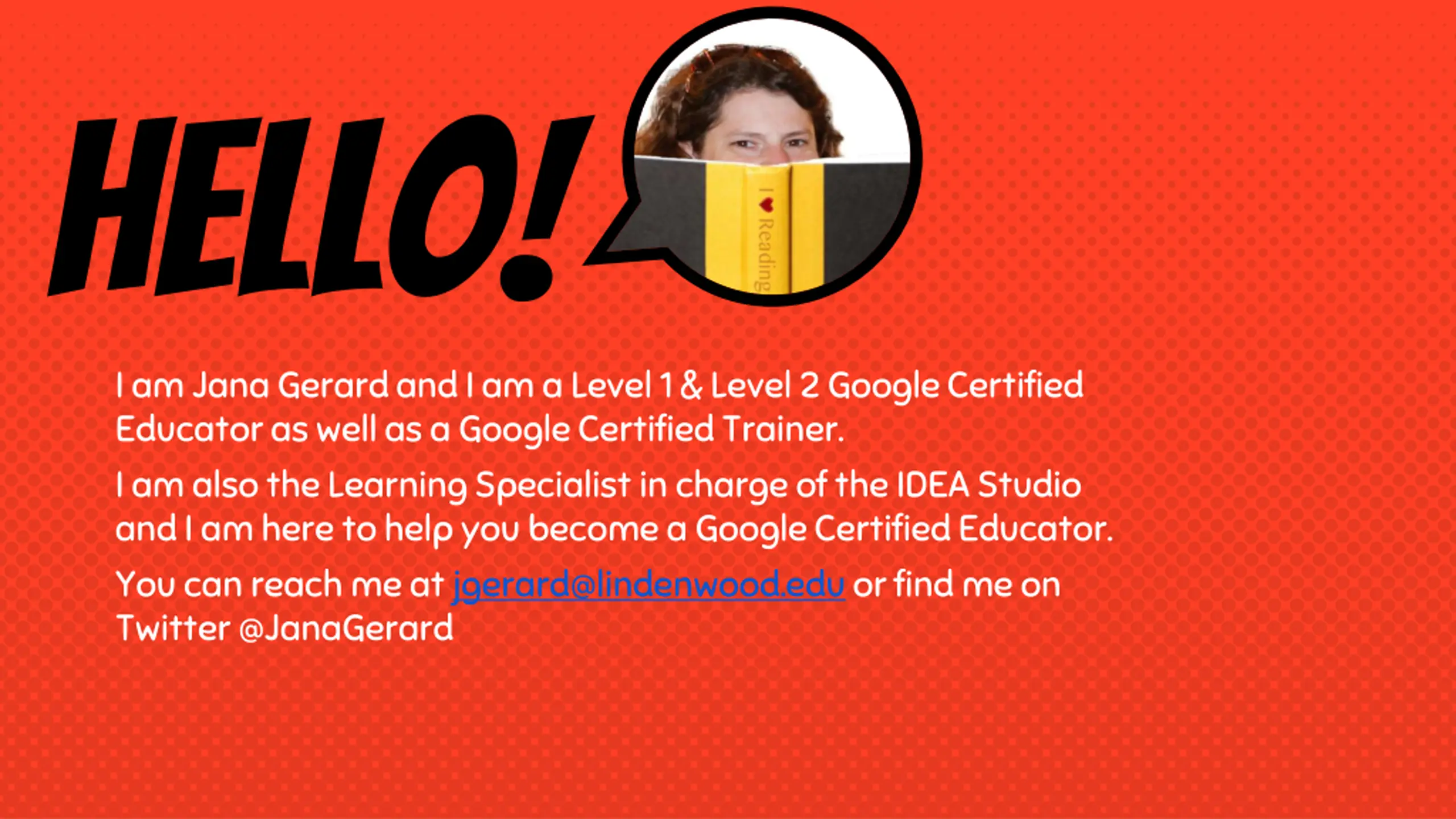Hello! I am Jana Gerard and I am a Level 1 & Level 2 Google Certified Educator as well as a Google Certified Trainer. I am also the Learning Specialist in charge of the IDEA Studio and I am here to help you become a Google Certified Educator. You can reach me at jgerard@lindenwood.eduor find me on Twitter @JanaGerard