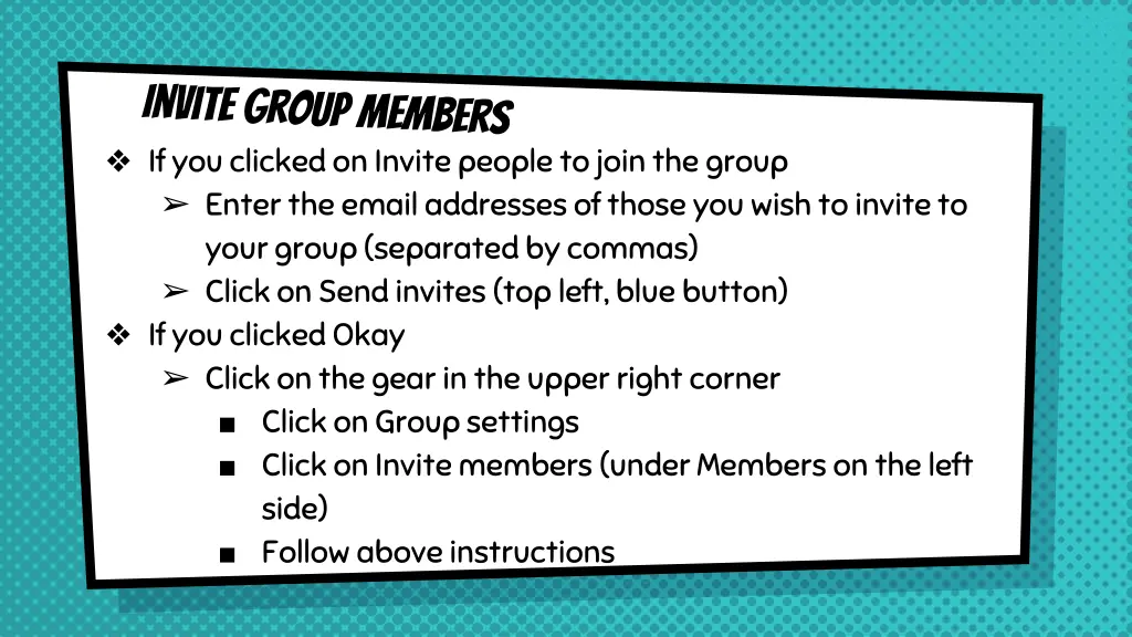 If you clicked on Invite people to join the group Enter the email addresses of those you wish to invite to your group (separated by commas) Click on Send invites (top left, blue button) If you clicked Okay Click on the gear in the upper right corner Click on Group settings Click on Invite members (under Members on the left side) Follow above instructions