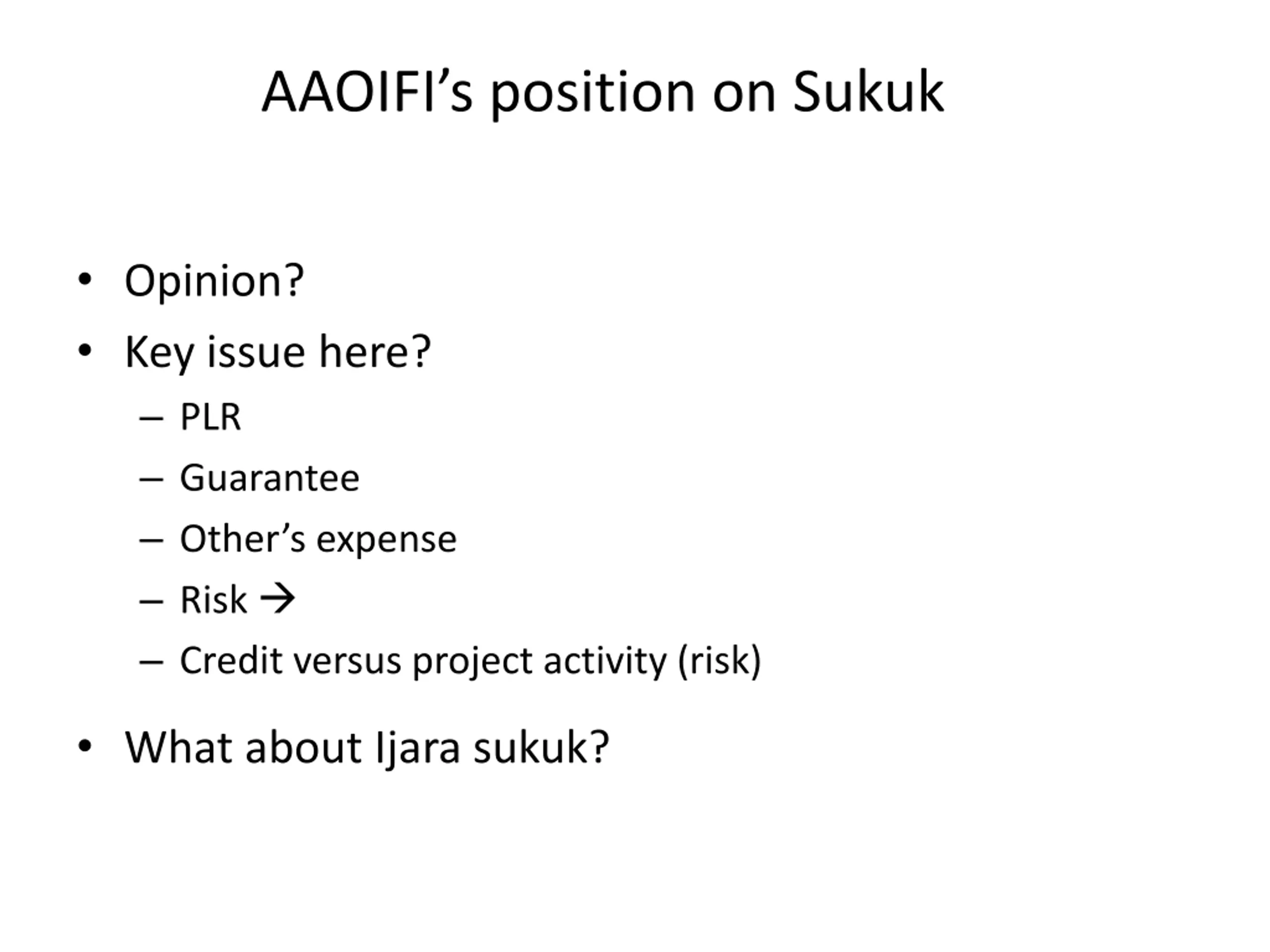 AAOIFIs position on Sukuk Opinion? Key issue here? PLR Guarantee Other s expense Risk Credit versus project activity (risk) What about Ijara sukuk?