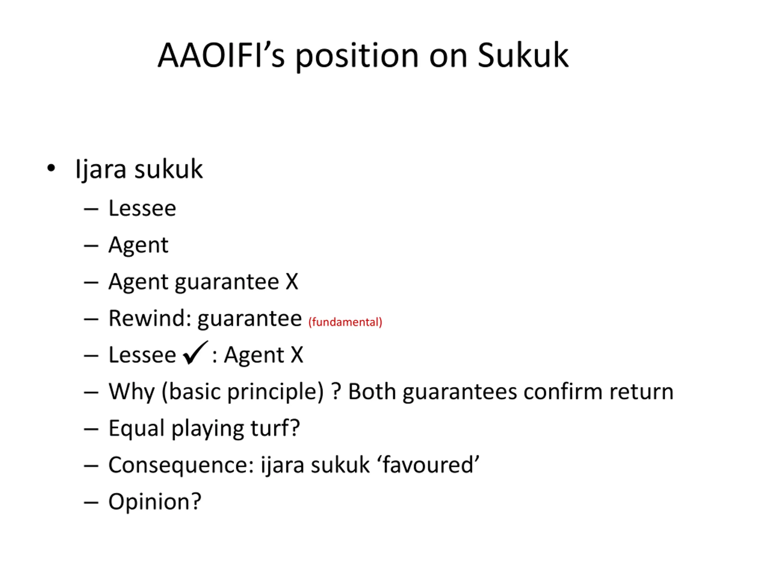 AAOIFIs position on Sukuk Ijara sukuk Lessee Agent Agent guarantee X Rewind: guarantee (fundamental) Lessee : Agent X Why (basic principle) ? Both guarantees confirm return Equal playing turf? Consequence: ijara sukuk favoured Opinion?