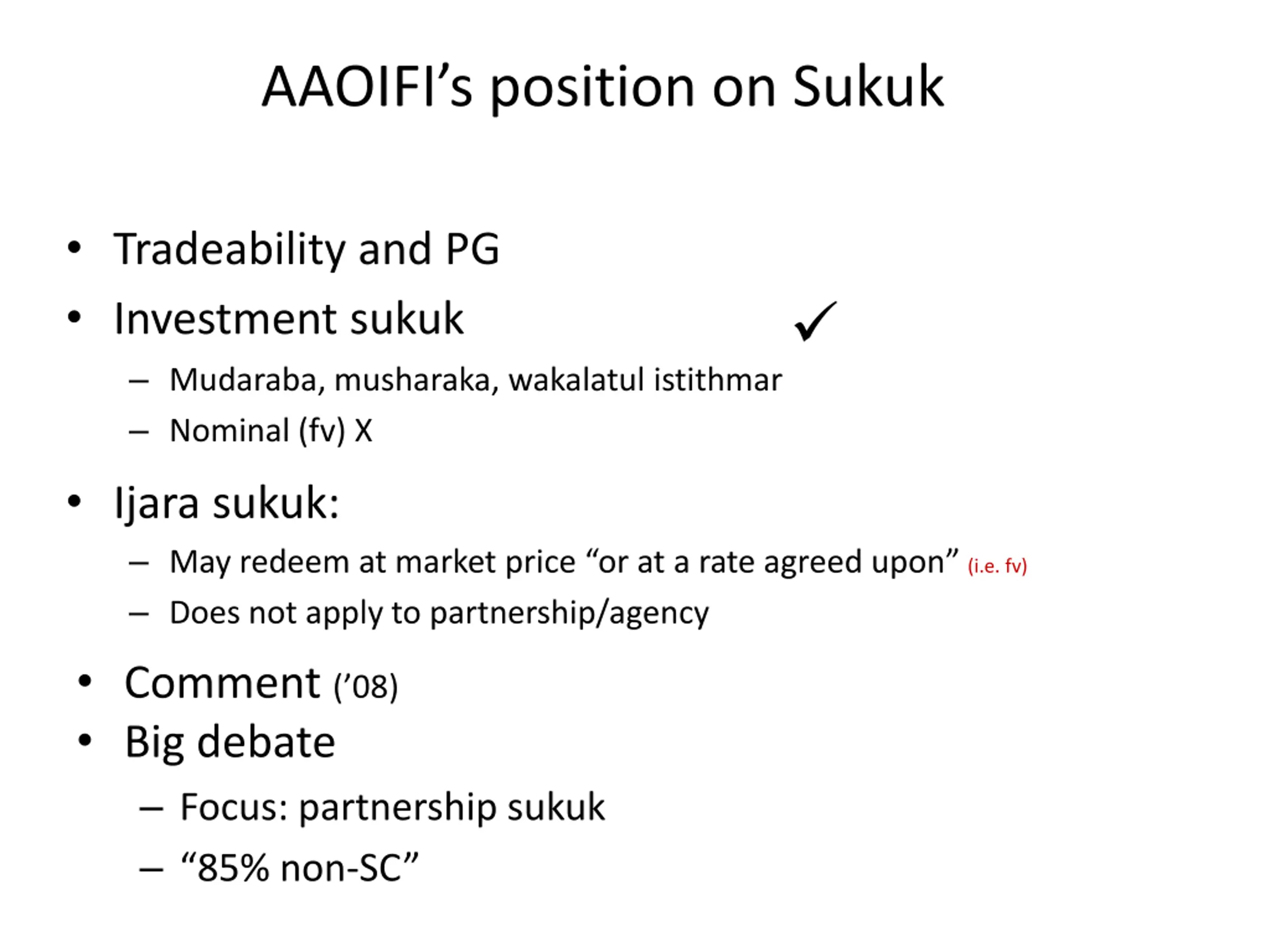 AAOIFIs position on Sukuk Tradeability and PG Investment sukuk Mudaraba, musharaka, wakalatul istithmar Nominal (fv) X Ijara sukuk: May redeem at market price or at a rate agreed upon (i.e. fv) Does not apply to partnership/agency Comment ( 08) Big debate Focus: partnership sukuk 85% non-SC