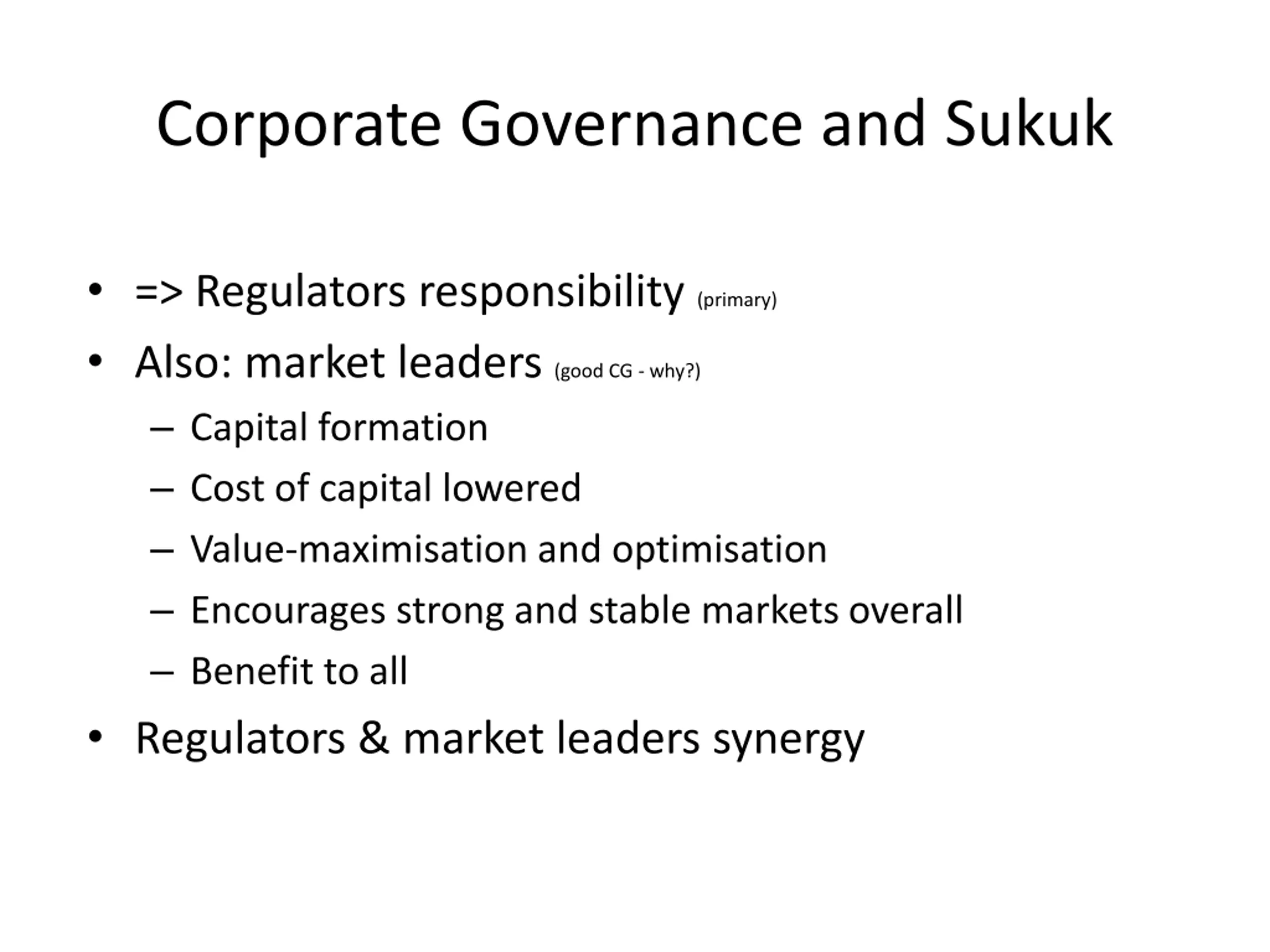 Corporate Governance and Sukuk => Regulators responsibility (primary) Also: market leaders (good CG - why?) Capital formation Cost of capital lowered Value-maximisation and optimisation Encourages strong and stable markets overall Benefit to all Regulators & market leaders synergy