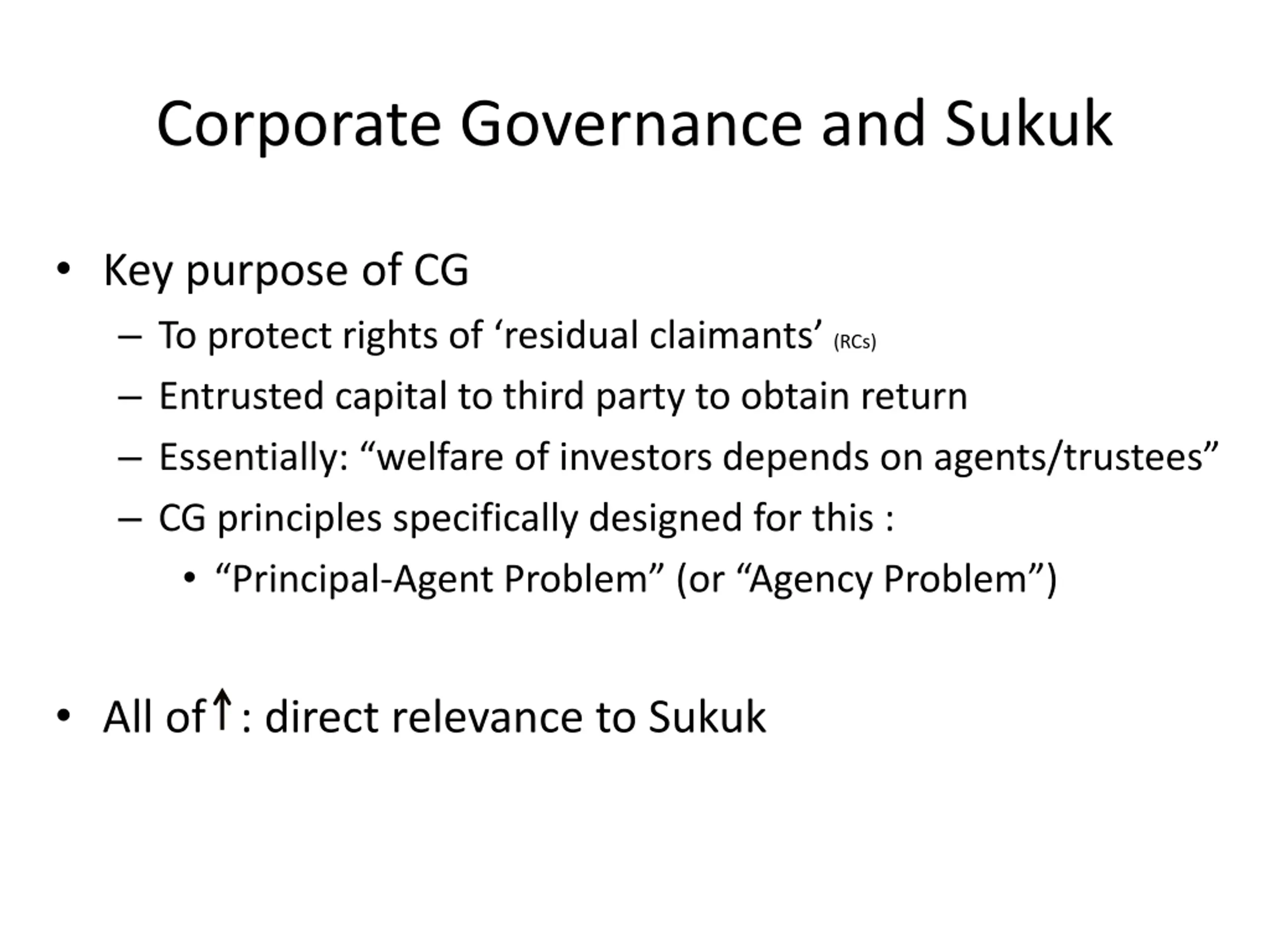 Corporate Governance and Sukuk Key purpose of CG To protect rights of residual claimants (RCs) Entrusted capital to third party to obtain return Essentially: welfare of investors depends on agents/trustees CG principles specifically designed for this : Principal-Agent Problem (or Agency Problem ) All of : direct relevance to Sukuk