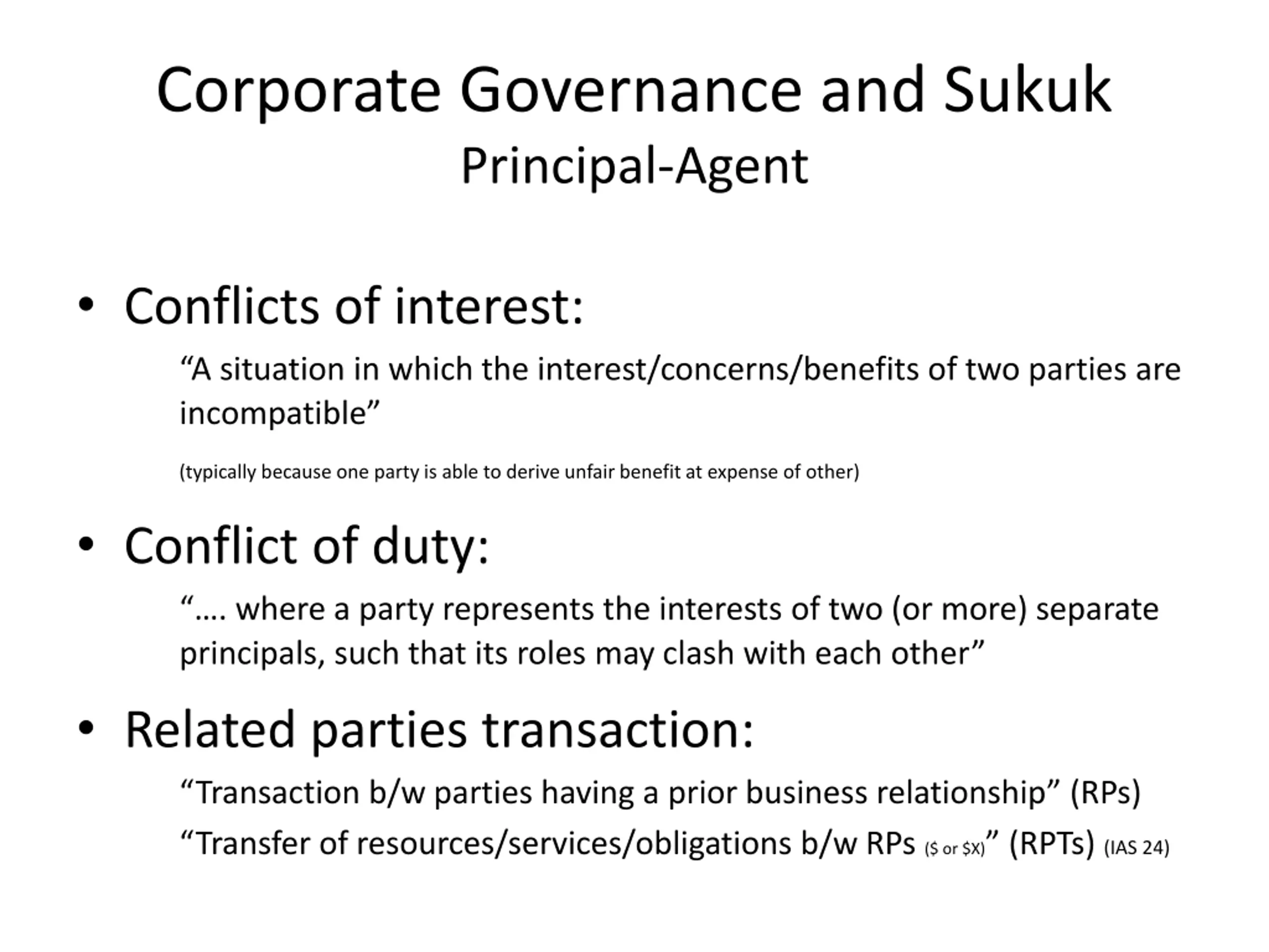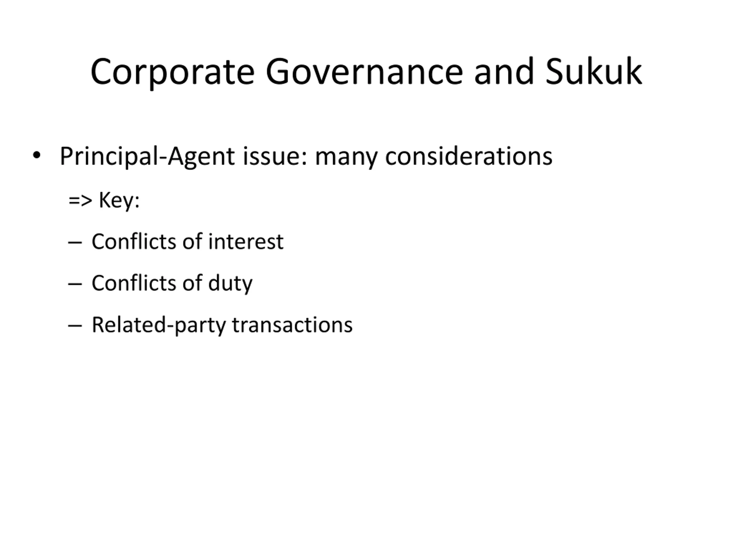 Corporate Governance and Sukuk Principal-Agent issue: many considerations => Key: Conflicts of interest Conflicts of duty Related-party transactions