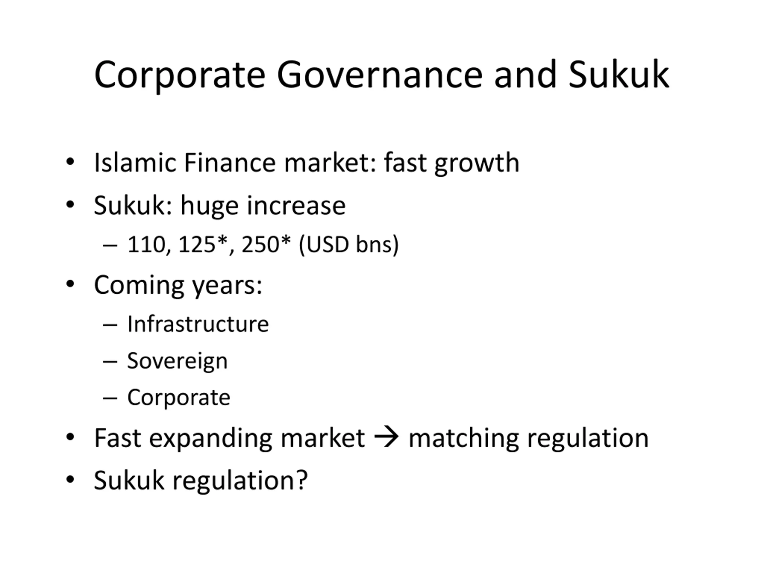 Corporate Governance and Sukuk Islamic Finance market: fast growth Sukuk: huge increase 110, 125*, 250* (USD bns) Coming years: Infrastructure Sovereign Corporate Fast expanding market matching regulation Sukuk regulation?