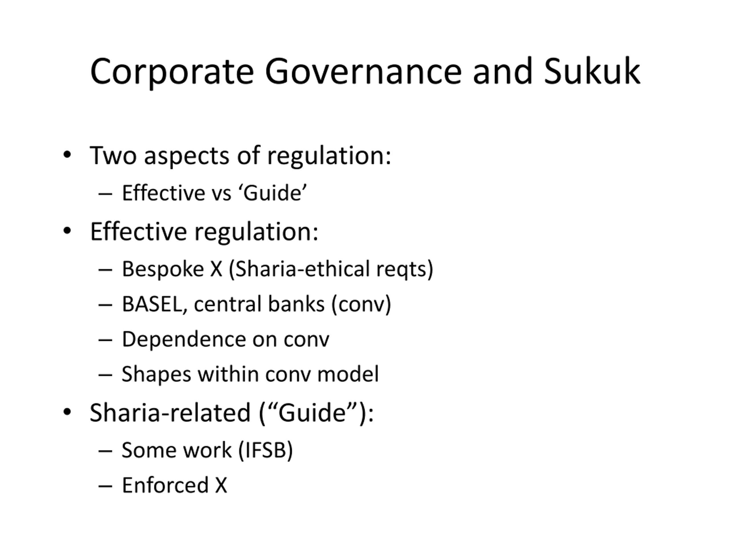 Corporate Governance and Sukuk Two aspects of regulation: Effective vs Guide Effective regulation: Bespoke X (Sharia-ethical reqts) BASEL, central banks (conv) Dependence on conv Shapes within conv model Sharia-related ( Guide ): Some work (IFSB) Enforced X