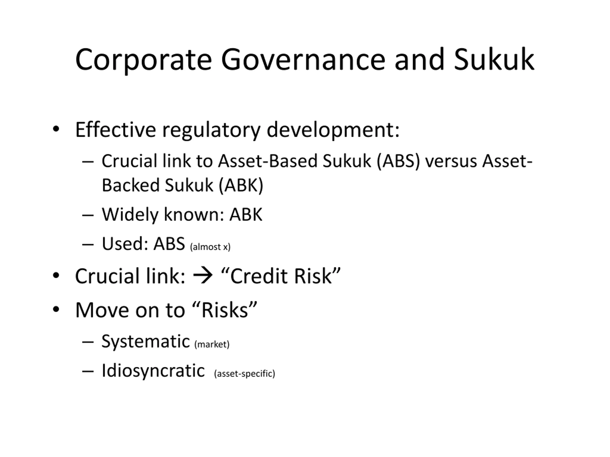 Corporate Governance and Sukuk Effective regulatory development: Crucial link to Asset-Based Sukuk (ABS) versus Asset- Backed Sukuk (ABK) Widely known: ABK Used: ABS (almost x) Crucial link: Credit Risk Move on to Risks Systematic (market) Idiosyncratic (asset-specific)